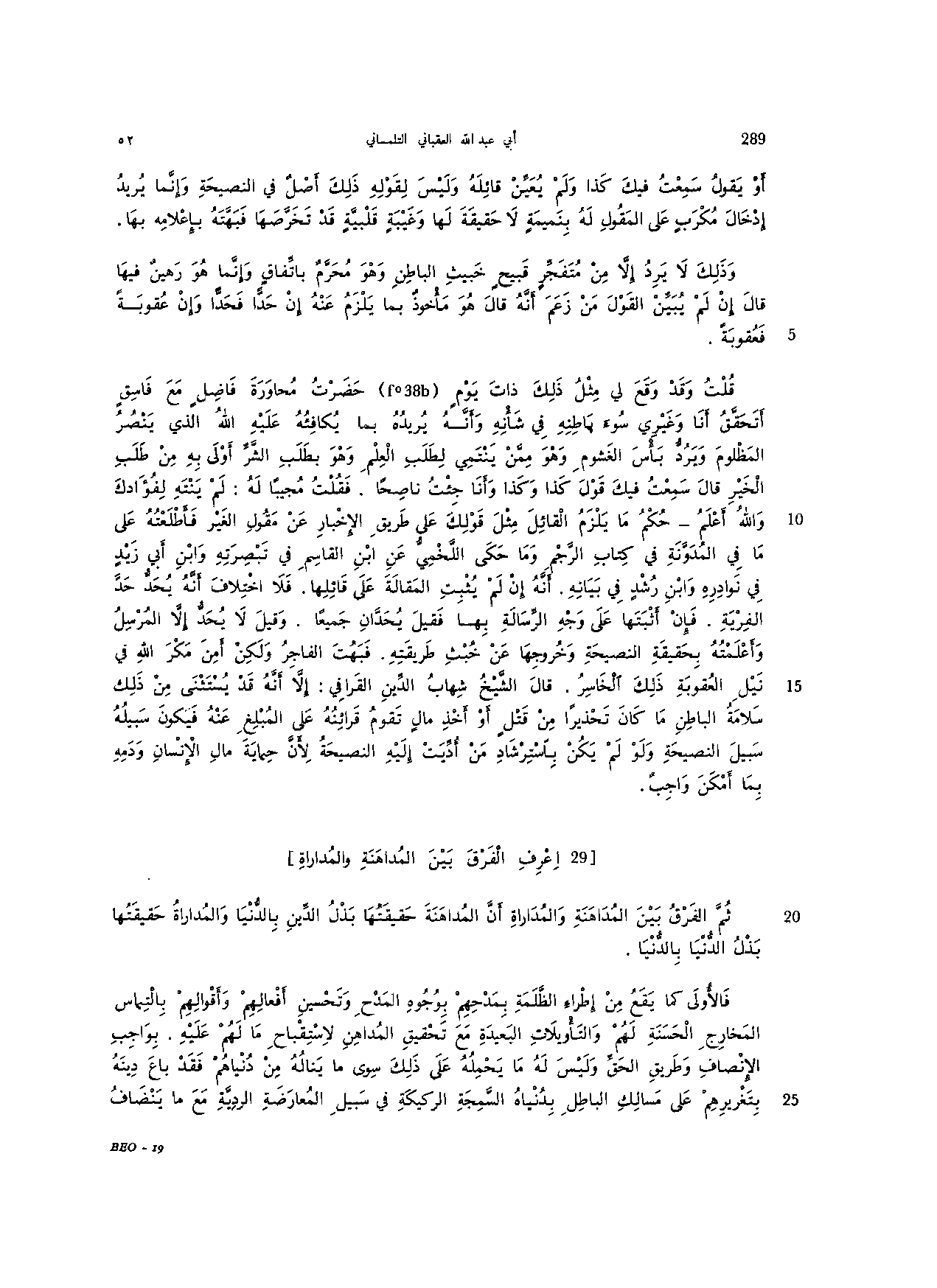 فالأولى كما يقع من إطراء الظلمة بمدحهم بوجوه المدح وتحسين أفعالهم وأقوالهم بالتماس المخارج الحسنة لهم والتأويلات البعيدة مع تحقيق المداهن لاستقباح ما لهم عليه. بواجب الإنصاف وطريق الحق وليس له ما يحمله على ذلك سوى ما يناله من دنياهم فقد باع دينه بتغريرهم على مسالك الباطل بدنياه السمحة الركيكة في سبيل المعارضة الردية مع ما ينضاف