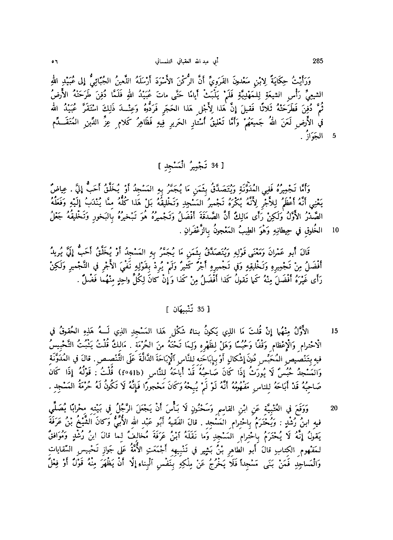الأول منهما إن قلت ما الذي يكون بناء شكل هذا المسجد الذي له هذه الحقوق في الاحترام والإعظام وقفًا وحبسًا وهل لظهره ولما تحته من الحرمة. مالك قلت يثبت التحبيس فيه بتنصيص المحبس دون إشكال أو بإباحته للناس الإباحة الدالة على التنصيص. قال في المدونة والمسجد حبس لا يورث إذا كان صاحبه قد أباحه للناس قلت: قوله إذا كان صاحبه قد أباحه للناس مفهومه أنه لو لم يبحه وكان محجورًا فإنه لا تكون له حرمة المسجد.
