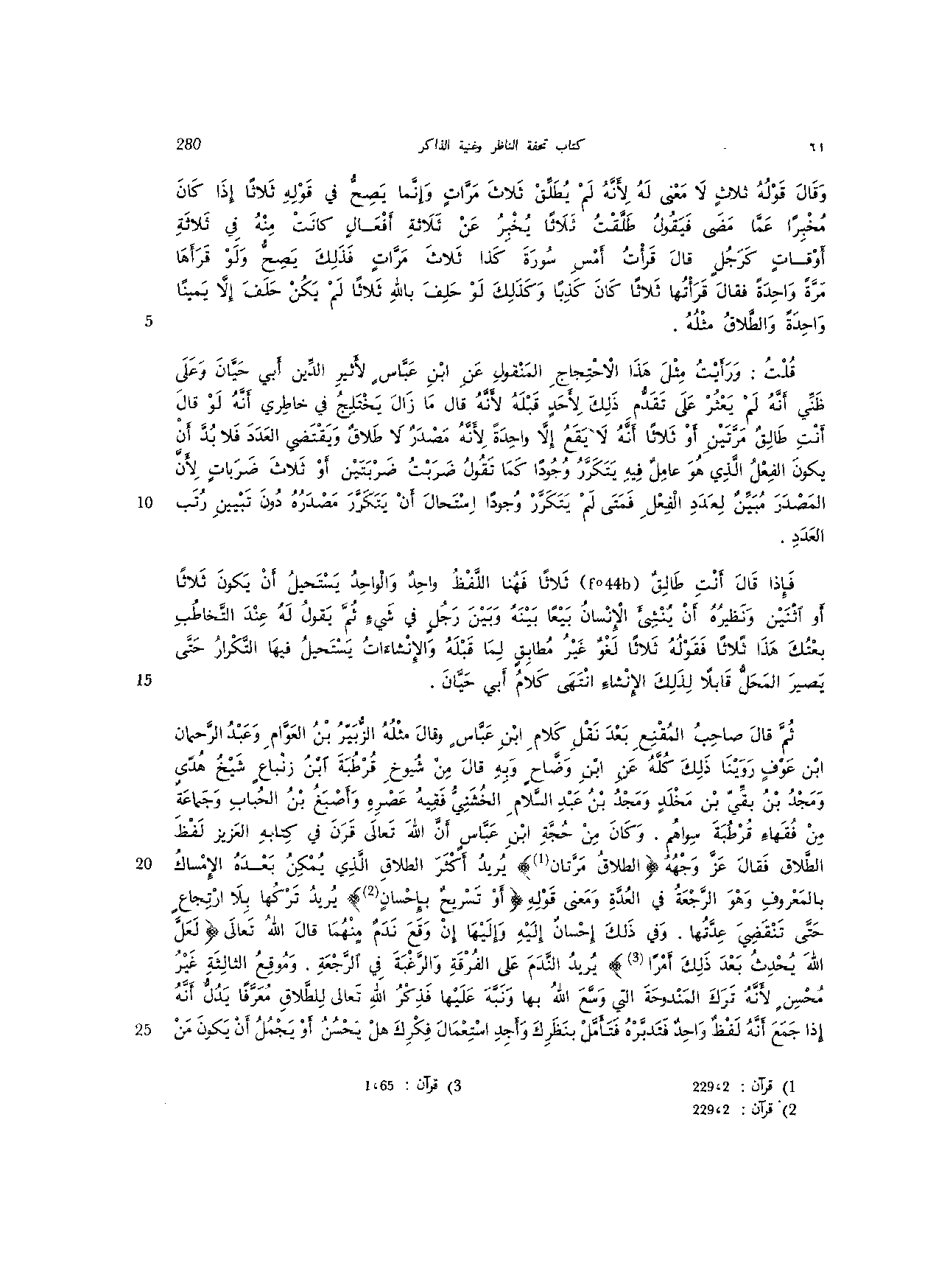 ثم قال صاحب المقنع بعد نقل كلام ابن عباس وقال مثله الزبير بن العوام وعبد الرحمن ابن عوف روينا ذلك كله عن ابن وضاح وبه قال ن شيوخ قرطبة ابن زنباع شيخ هدى ومد بن بقي بن مخلد ومجد بن عبد السلام الخشني فقيه عصره وأصبغ بن الحباب وجماعة من فقهاء قرطبة سواهم. وكان من حجة ابن عباس أن الله تعالى قرن في كتابه العزيز لفظ الطلاق فقال عز وجهه {الطلاق مرتان} يريد أكثر الطلاق الذي يمكن بعده الإمساك بالمعروف وهو الرجعة في العدة ومعنى قوله: {أو تسريح بإحسان} يريد تركها بلا ارتجاع حتى تنقضي عدتها. وفي ذلك إحسان إليه وإليها إن وقع ندم منهما قال الله تعالى: {لعل الله يحدث بعد ذلك أمرا} يريد الندم على الفرقة والرغبة في الرجعة. وموقع الثالثة غير محسن لأنه ترك المندوحة التي وسع الله بها ونبه عليها فذكر الله تعالى للطلاق معرفا يدل أنه إذا جمع أنه لفظ واحد فتدبره فتأمل بنظرك وأجد استعمال فكرك هل يحسن أو يجمل أن يكون من
