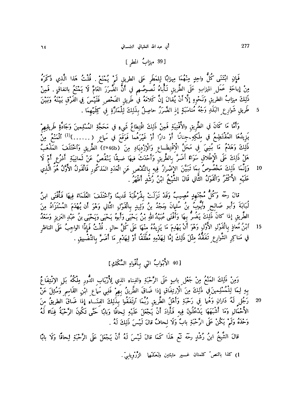 قال رحه وكل مجتهد مصيب وقد نزلت بقرطبة قديما واختلف العلماء فيها فأفتى ابن لبابة وأبو صالح وأيوب بن سلمان ومجد بن وليد بالقول الثاني وهو أن يهدم المستزاد من الطريق إذا كان ذلك يضر بها وأفتى عبيد الله بن يحيى وأبوه يحيى ويحيى بن عبد العزيز وسعد ابن معاذ بالقول الأول وهو أن يهدم ما يزيده منها على كل حال. قلت فإذا الواجب على الناظر في مناكر الشارع تفقد مثل ذلك إما لهدمه مطلقا أو لهدم ما أضر بالتضييق.
