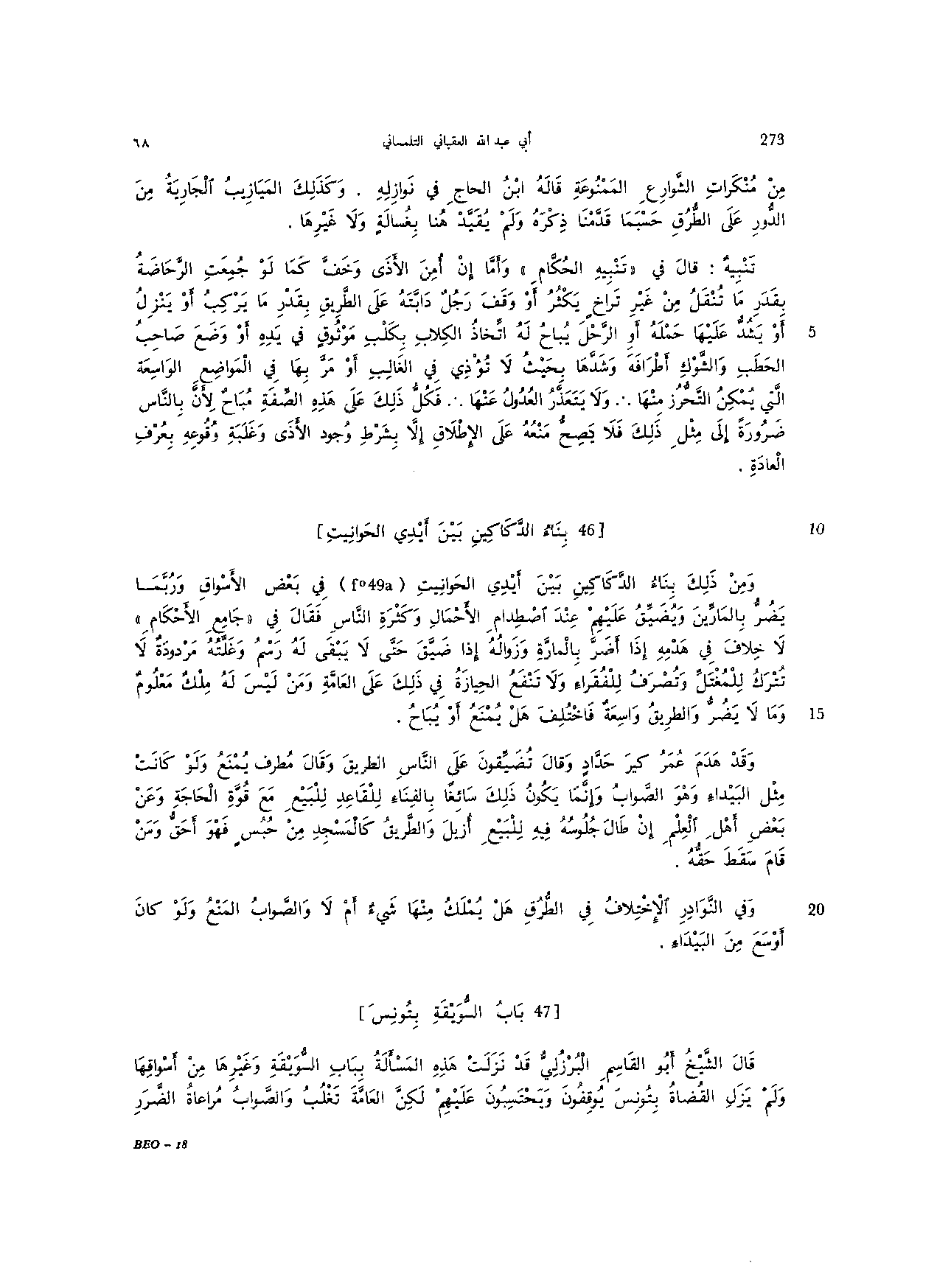 قال الشيخ أبو القاسم البرزلي قد نزلت هذه المسألة بباب السويقة وغيرها من أسواقها ولم يزل القضاة بتونس يوقفون ويحتسبون عليهم لكن العامة تغلب والصواب مراعاة الضرر