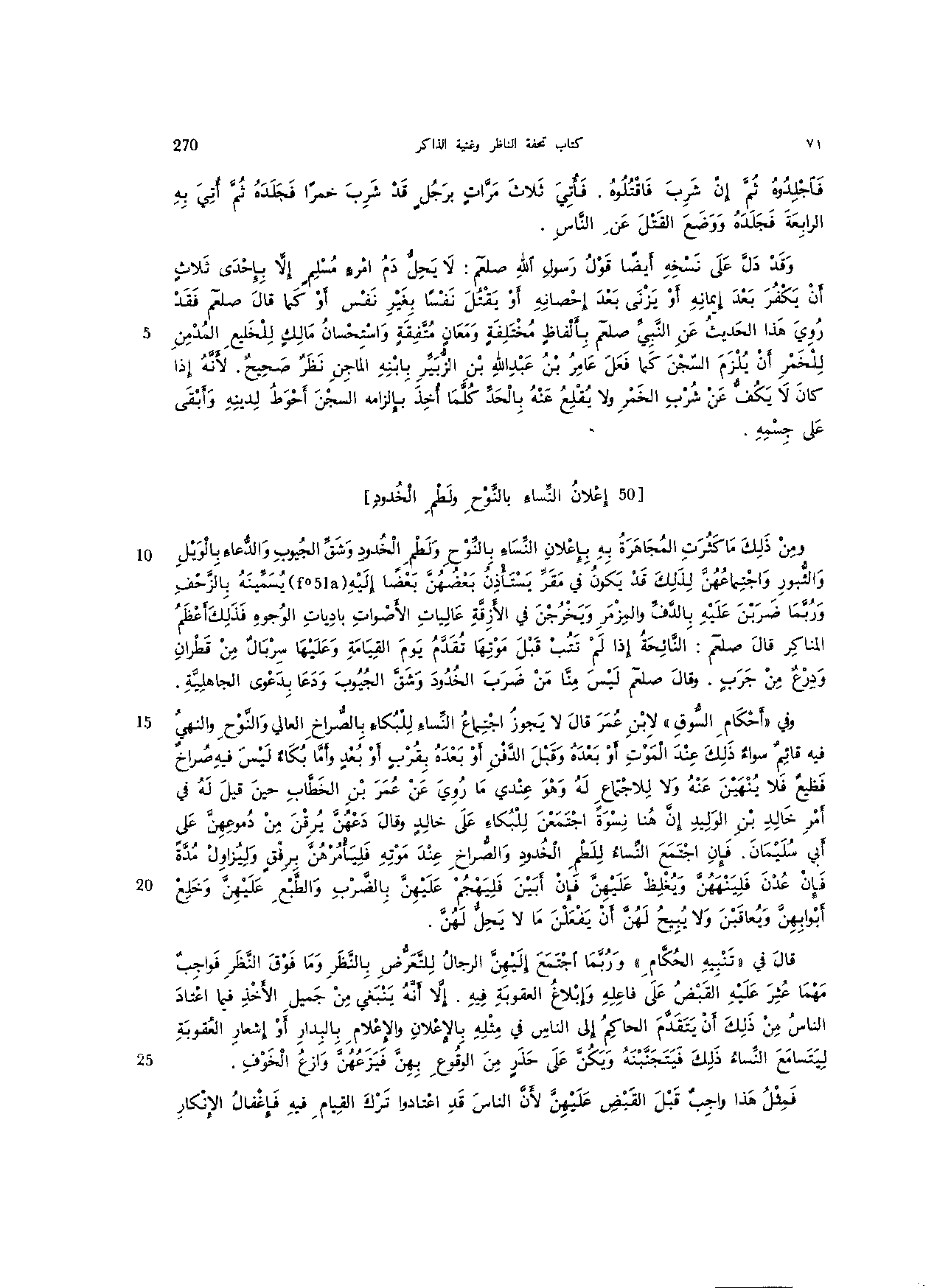 ومن ذلك ما كثرت المجاهرة به بإعلان النساء بالنوح ولطم الخدود وشق الجيوب والدعاء بالويل والثبور واجتماعهن لذلك قد يكون في مقر يستأذن بعضهن بعضًا إليه يسمينه بالزحف وربما ضربن عليه بالدف والمزمر ويخرجن في الأزقة عاليات الأصوات باديات الوجوه فذلك أعظم المناكر قال صلعم: النائحة إذا لم تتب قبل موتها تقدم يوم القيامة وعليها سربال من قطران ودرع من جرب. وقال صلعم ليس منا من ضرب الخدود وشق الجيوب ودعا بدعوى الجاهلية.
