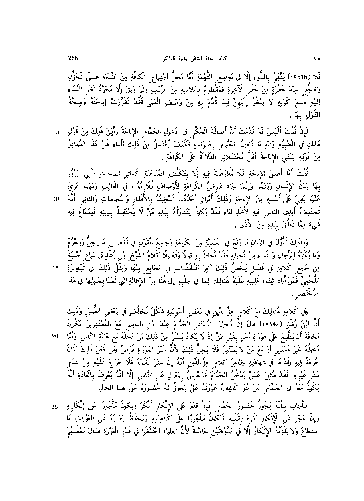 وبذلك تأول في البيان ما وقع في العتبية من الكراهة وجامع القول في تفصيل ما يحل ويحرم وما يكره للرجال والنساء من دخوله فقد أحاط به قولا وتعليلا كلام الشيخ بن رشد في سماع أصبغ من جامع كلامه في فصل يخص ذلك آخر المقدمات في الجامع منها ومثل ذلك في تبصرة اللخمي فمن أراد شفاء غليله طلبه هنالك لما في جلبه إلى هنا من الإطالة التي لسنا بسبيلها في هذا المختصر.