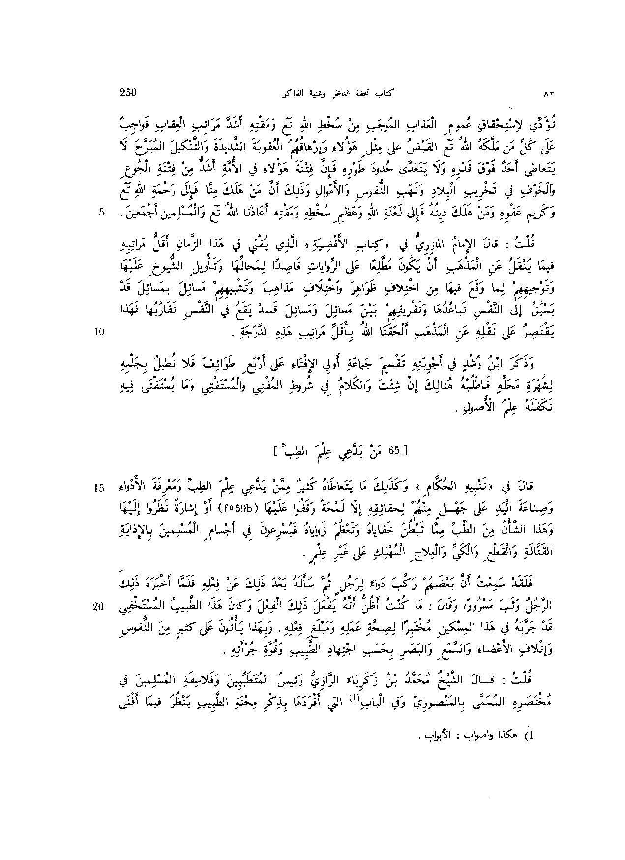 قلت: قال الشيخ محمد بن زكريا الرازي رئيس المتطببين وفلاسفة المسلمين في مختصره المسمى بالمنصوري وفي الباب التي أفردها بذكر محنة الطبيب ينظر فيما أفنى