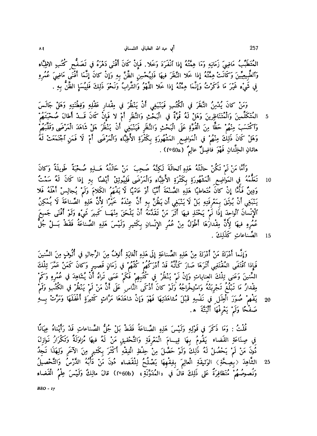 وإنما أدرك من أدرك من هذه الصناعة إلى هذه الغاية ألوف من الرجال في ألوف من السنين فإذا اقتفى المقتفي أثرها صار كأنه قد أدركهم كلهم في زمان قصير وكان كمن عمر تلك السنين وعنى تلك العنايات وإن لم ينظر في كتبهم فكم عسى تراه أن يشاهد في عمره وكم مقدار ما تبلغ تجربته واستخراجه ولو كان أذكى الناس على أن من لم ينظر في الكتب ولم يفهم صور العلل في نفسه قبل مشاهدتها فهو وإن شاهدها مرات كثيرة أغفلها ومرت به صفحا ولم يعرفها البتنة هـ.