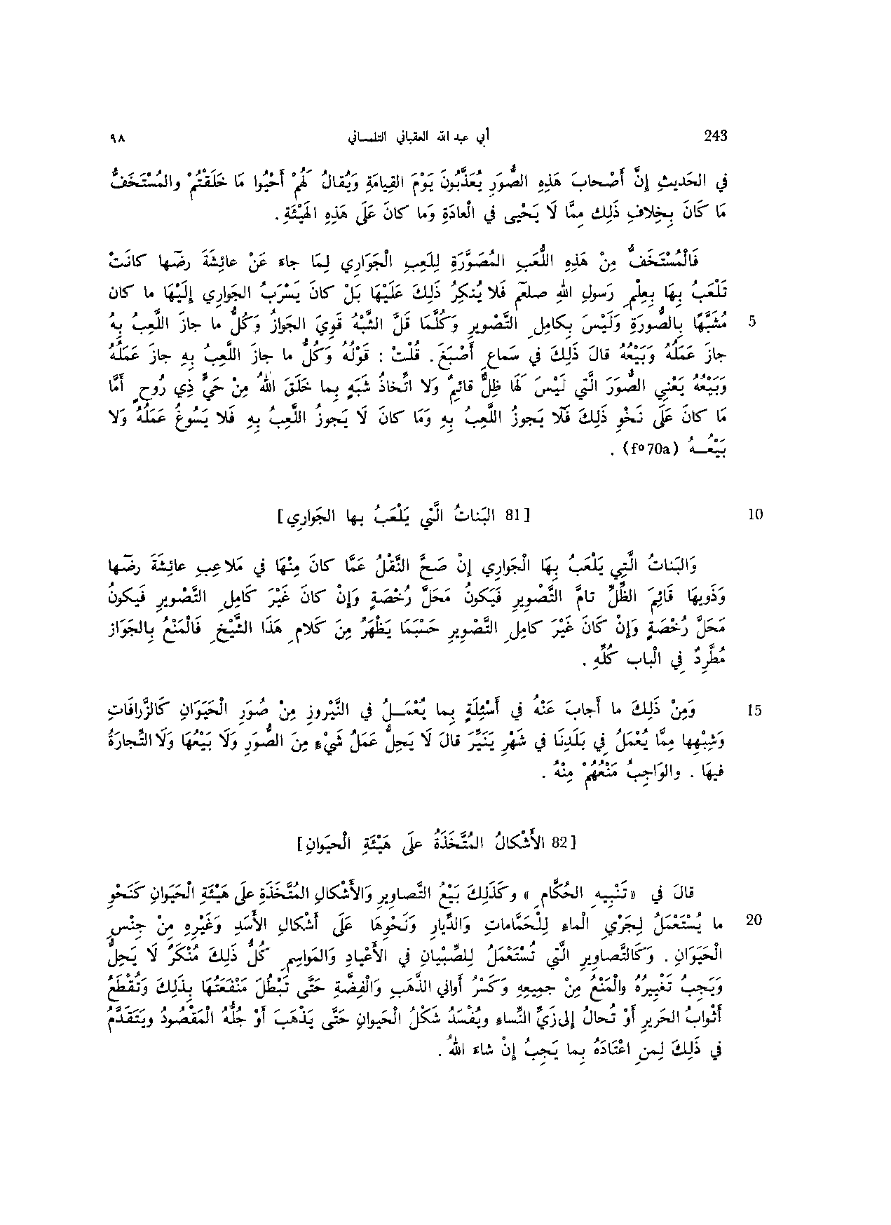 والبنات التي يلعب بها الجواري إن صح النقل عما كان منها في ملاعب عائشة رضها وذويها قائم الظل تام التصوير فيكون محل رخصة وإن كان غير كامل التصوير فيكون محل رخصة وإن كان غير كامل التصوير حسبما يظهر من كلام هذا الشيخ فالمنع بالجواز مطرد في الباب كله.