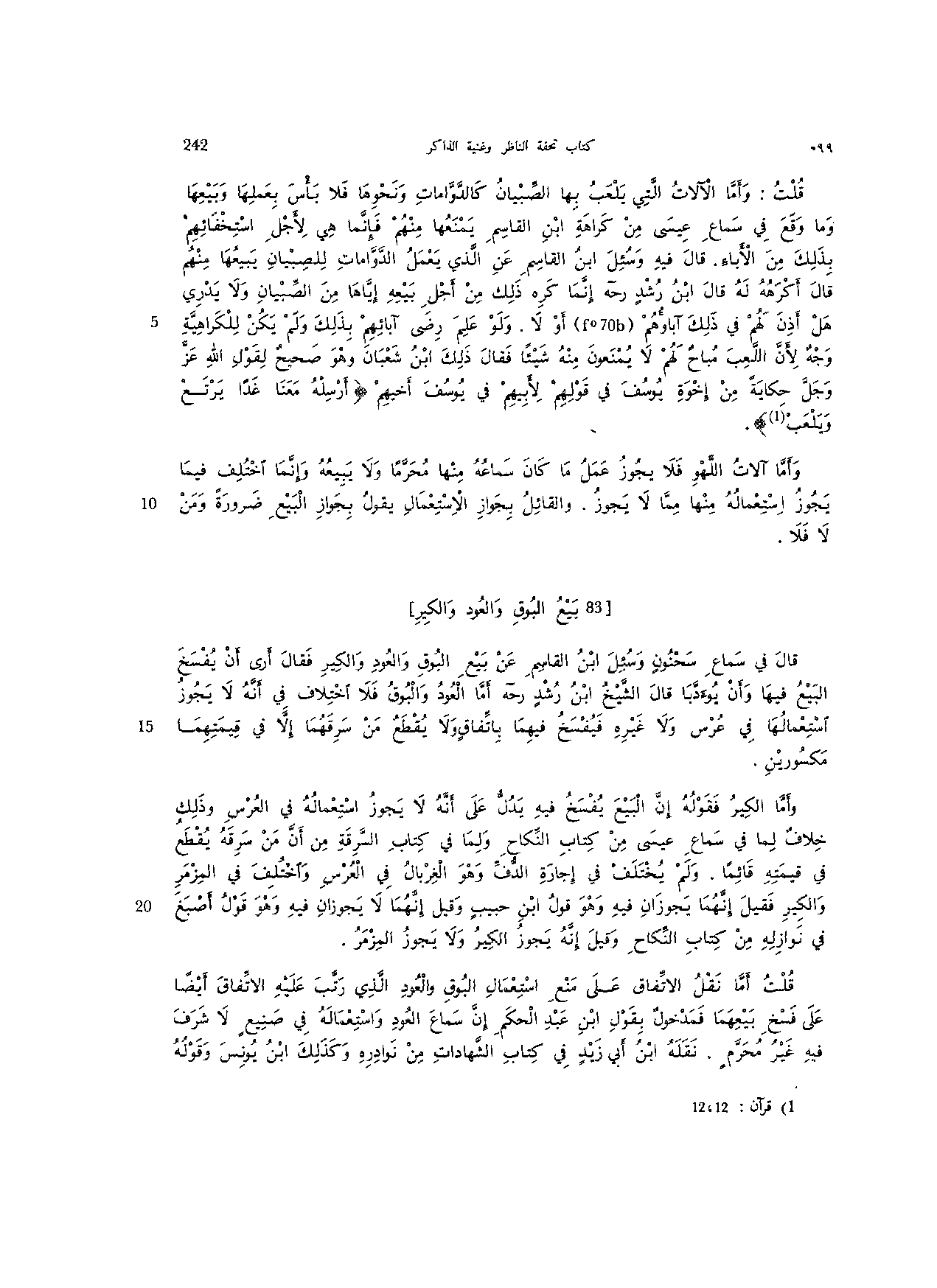 قلت أما نقل الاتفاق على منع استعمال البوق والعود الذي رتب عليه الاتفاق أيضا على فسخ بيعهما فمدخول بقول ابن عبد الحكم إن سماع العود واستعماله في صنيع لا شرف فيه غير محرم. نقله ابن أبي زيد في كتاب الشهادات من نوادره وكذلك ابن يونس وقوله