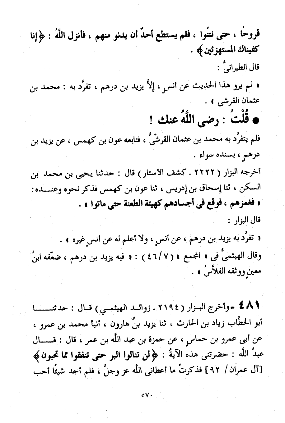 481- وأخرج البزار (2194 - زوائد الهيثمى) قال: حدثنا أبو الخطاب زياد بن الحارث، ثنا يزيد بن هارون أنبأ محمد بن عمرو عن أبى عمرو بن حماس عن حمزة بن عبد الله بن عمر، قال: قال عبد الله: حضرتني هذه الآية (لن تنالوا البر حتى تنفقوا مما تحبون) (آل عمران - 92) فذكرت ما أعطانى الله عز وجل، فلم أجد شيئا أحب