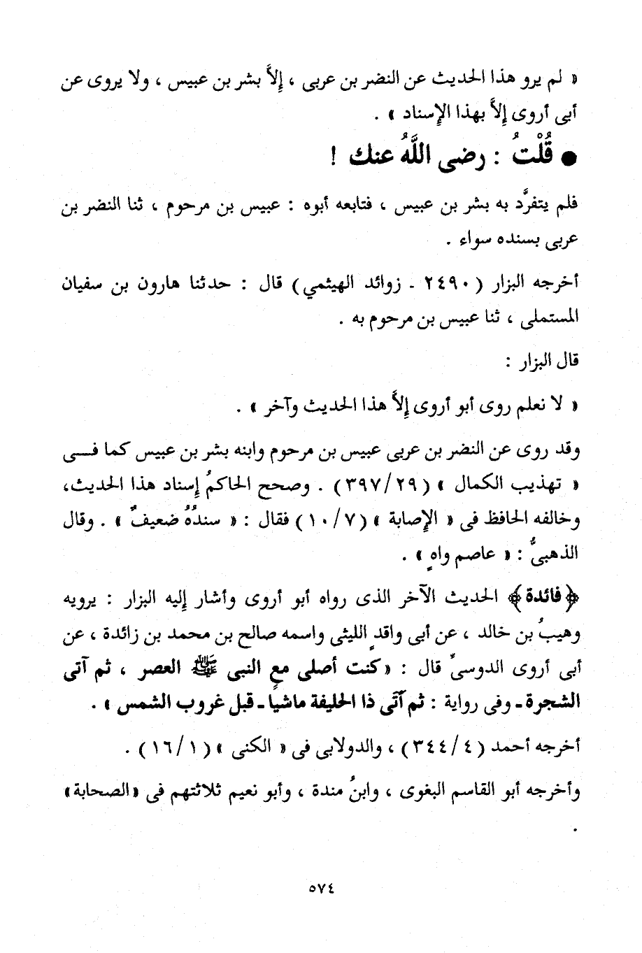 (فائدة) الحديث الآخر الذي رواه أبو أروى وأشار إليه البزار: يرويه وهيبُ بن خالد، عن أبي واقد الليثي واسمه صالح بن محمد بن زائدة، عن أبي أروى الدوسيّ قال: (كنت أصلي مع النبي صلى الله عليه وسلم العصر، ثم آتى الشجرة - وفي رواية: ثم آتى ذا الحليفة ماشياً - قبل غروب الشمس) .