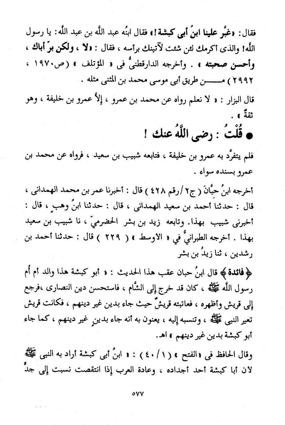 فقال: "غبَّر علينا ابنُ أبي كبشة! " فقال ابنهُ عبد الله بن عبد الله: يا رسول الله! والذي أكرمك لئن شئت لآتينك برأسه، فقال: "لا، ولكن برّ أباك، وأحسن صحبته". وأخرجه الدارقطنيُّ في "المؤتلف" [ص 1970، 2992] من طريق أبي موسى محمد بن المثنى مثله.