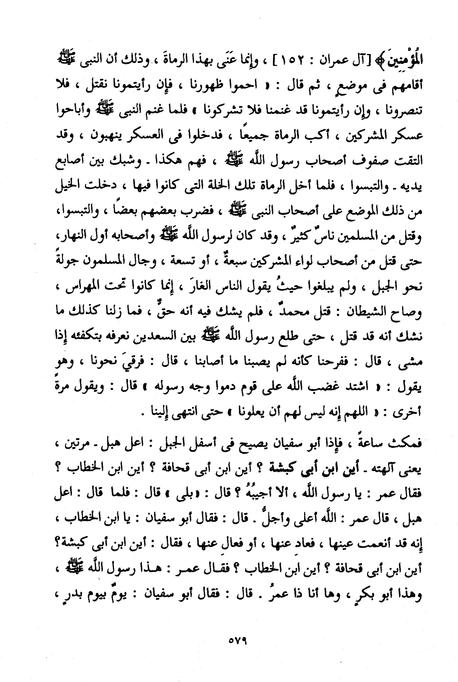فمكث ساعةً، فإِذا أبو سفيان يصيح في أسف الجبل: اعل هبل - مرتين، يعنى آلهته - أين ابن أبي كبشة؟ أين ابن أبي قحافة " أين ابن الخطاب؟ فقال عمر: يا رسول الله، ألا أجيبُهُ؟ قال: "بلى" قال: فلما قال: اعل هبل، قال عمر: الله أعلى وأجلُّ. قال: فقال أبو سفيان، يا ابن الخطاب، إِنه قد أنعمت عينها، فعاد عنها، أو فعالِ عنها، فقال: أين ابن أبي كبشة؟ أين ابن أبي قحافة؟ أين ابن الخطاب؟ فقال عمر: هذا رسول الله - صلى الله عليه وسلم - وهذا أبو بكرٍ، وها أنا ذا عمرُ. قال: فقال أبو سفيان: يومٌ بيوم بدرٍ،