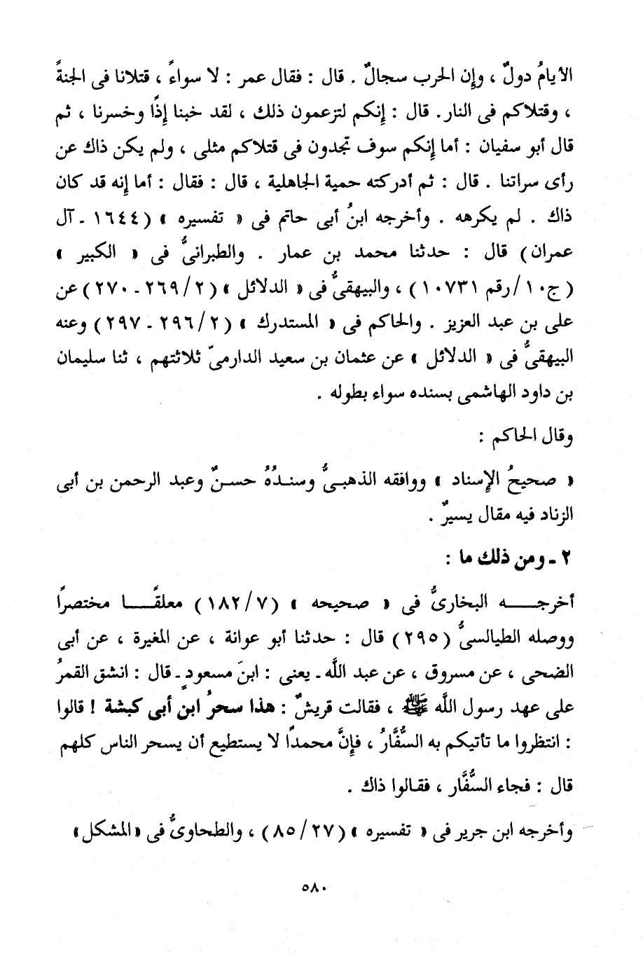 الأيامُ دولٌ، وإِن الحرب سجالٌ. قال: فقال عمر: لا سواءَ، قتلانا في الجنةِ، وقتلاكم في النار. قال: إِنكم لتزعمون ذلك، لقد خبنا إِذَا وخسرنا، ثم قال أبو سفيان: أما إِنكم سوف تجدون في قتلاكم مثلى، ولم يكن ذلك عن رأي سراتنا. قال: ثم أدركته حمية الجاهلية، قال: فقال: أما إِِنه قد كان ذاك. لم يكرهه. وأخرجه ابنُ أبي حاتم في "تفسيره" [1644 - آل عمران] قال: حدثنا محمد بن عمار. والطبرانيُّ في "الكبير" [ج10/ رقم 10731] ، والبيهقيُّ في "الدلائل" [2/ 269 - 270] عن علي بن عبد العزيز. والحاكم في "المستدرك" [2/296 - 297] وعنه البيهقيُّ في "الدلائل" عن عثمان بن سعيد الدارميّ ثلاثتهم، ثنا سليمان بن داود الهاشمي بسنده سواء بطوله.