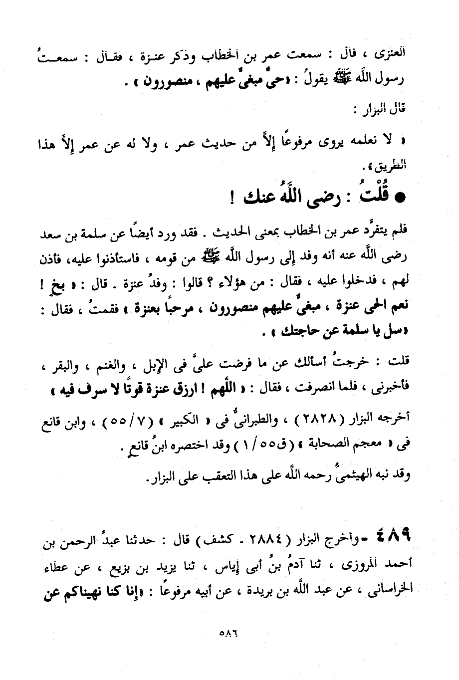 العنزي، قال: سمعت عمر بن الخطاب وذكر عنزة، فقال: سمعتُ رسول الله - صلى الله عليه وسلم - يقولُ: "حيُّ مبغىّ عليهم، منصورون".