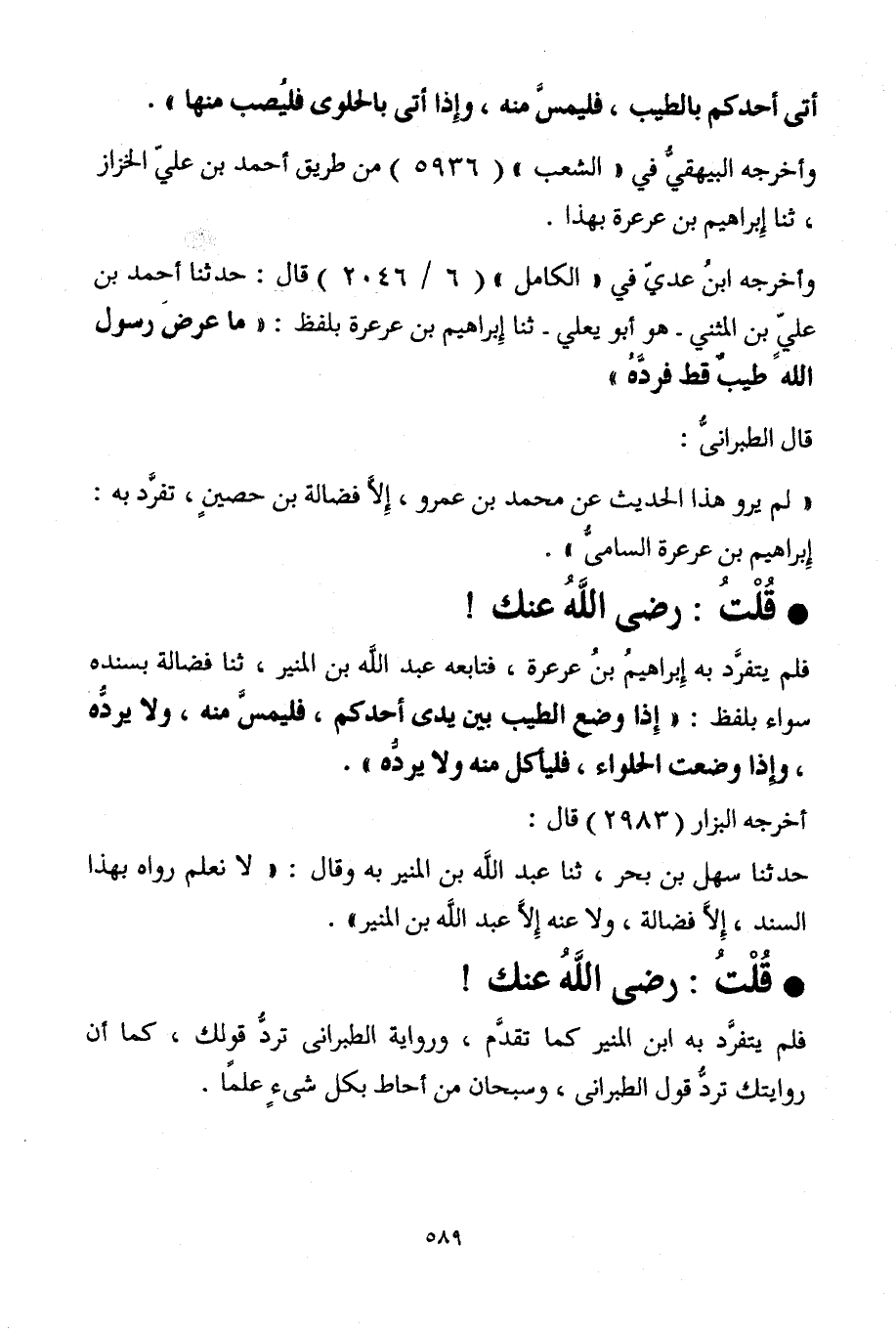 فلم يتفرَّد به إِبراهيمُ بنُ عرعرة، فتابعه عبد الله بن المنير، ثنا فضالة بسنده سواء بلفظ: "إذا وضع الطيب بين يدي أحدكم، فليمسَّ منه، ولا يردَّه، وإذا وضعت الحلواء، فليأكل منه ولا يردَّه ".