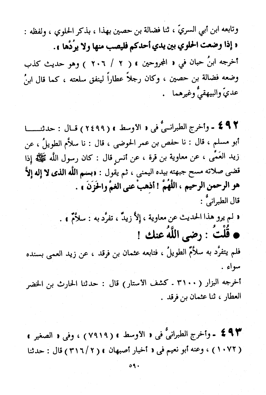 492 - وأخرج الطبرانيُّ في "الأوسط" [2499] قال: حدثنا أبو مسلم، قال: نا حفص بن عمر الحوضى، قال: نا سلاَّم الطويلُ، عن زيد العَمِّي، عن معاوية بن قرة، عن أنسٍ قال: كان رسول الله - صلى الله عليه وسلم - إذا قضى صلاته مسح جبهته بيده اليمنى، ثم يقول: "بسم الله الذي لا إله إلاَّ هو الرحمن الرحيم، اللَّهُمَّ! أذهبْ عني الغمَّ والحَزَنَ ".