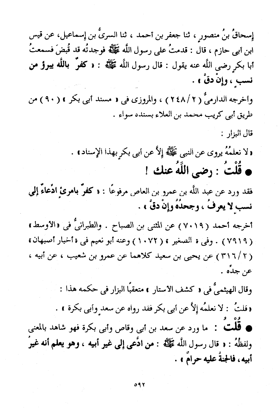 إِسحاقُ بنُ منصورٍ، ثنا جعفر بن أحمد، ثنا السريُّ بن إِسماعيل، عن قيس ابن أبي حازم، قال: قدمتُ على رسول الله - صلى الله عليه وسلم - فوجدتُه قد قُبضَ فسمعتُ أبا بكرٍ - رضي الله عنه - يقول: قال رسول الله - صلى الله عليه وسلم -: "كفرٌ بالله يبرؤ من نسبٍ، وإِنْ دقَّ".