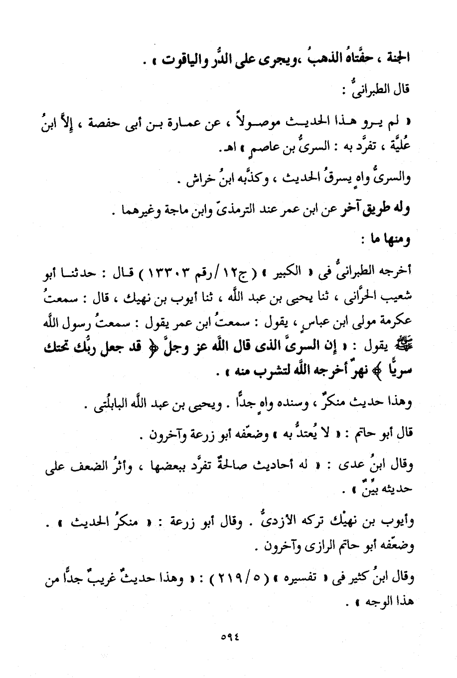 أخرجه الطبرانيُّ في "الكبير" [ج12/ رقم 13303] قال حدثنا أبو شعيب الحرَّاني، ثنا يحيى بن عبد الله، ثنا أيوب بن نهيك، قال: سمعتُ عكرمة مولى ابن عباسٍ: يقول سمعتُ ابن عمر يقول: سمعتُ رسول الله - صلى الله عليه وسلم - يقول: "إِن السرىَّ الذي قال الله عز وجلَّ {قد جعل ربُّك تحتك سريَّا} نهرٌ أخرجه الله لتشرب منه".