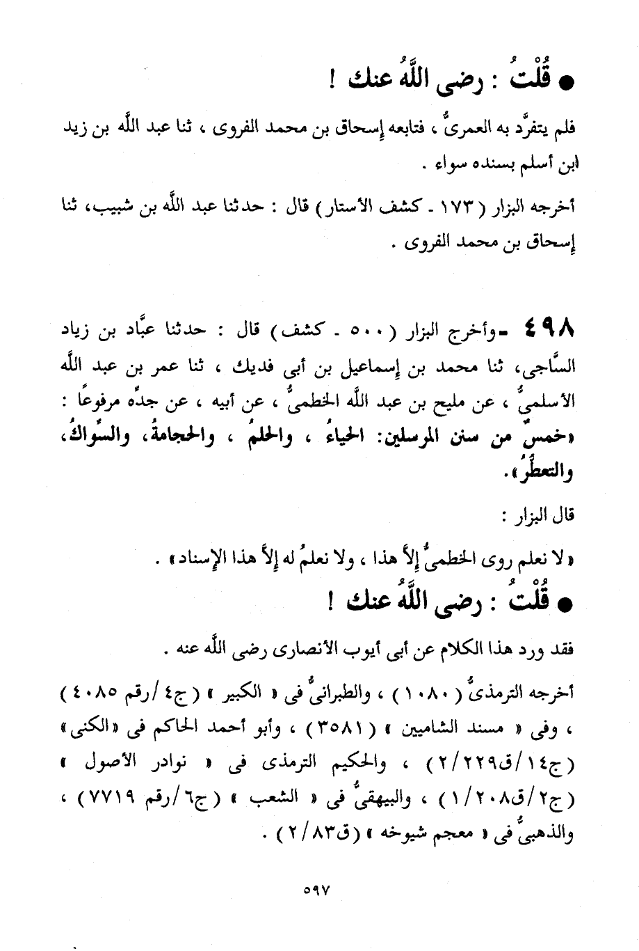 498 - وأخرج البزار [500 - كشف] قال: حدثنا عبَّاد بن زياد السَّاجي، ثنا محمد بن إِسماعيل بن أبي فديك، ثنا عمر بن عبد الله الأسلميُّ، عن مليح بن عبد الله الخطميُّ، عن أبيه، عن جدِّه مرفوعًا: "خمسٌ من سنن المرسلين: الحياءُ، والحلمُ، والحجامةُ، والسِّواكُ، والتعطُّرُ".