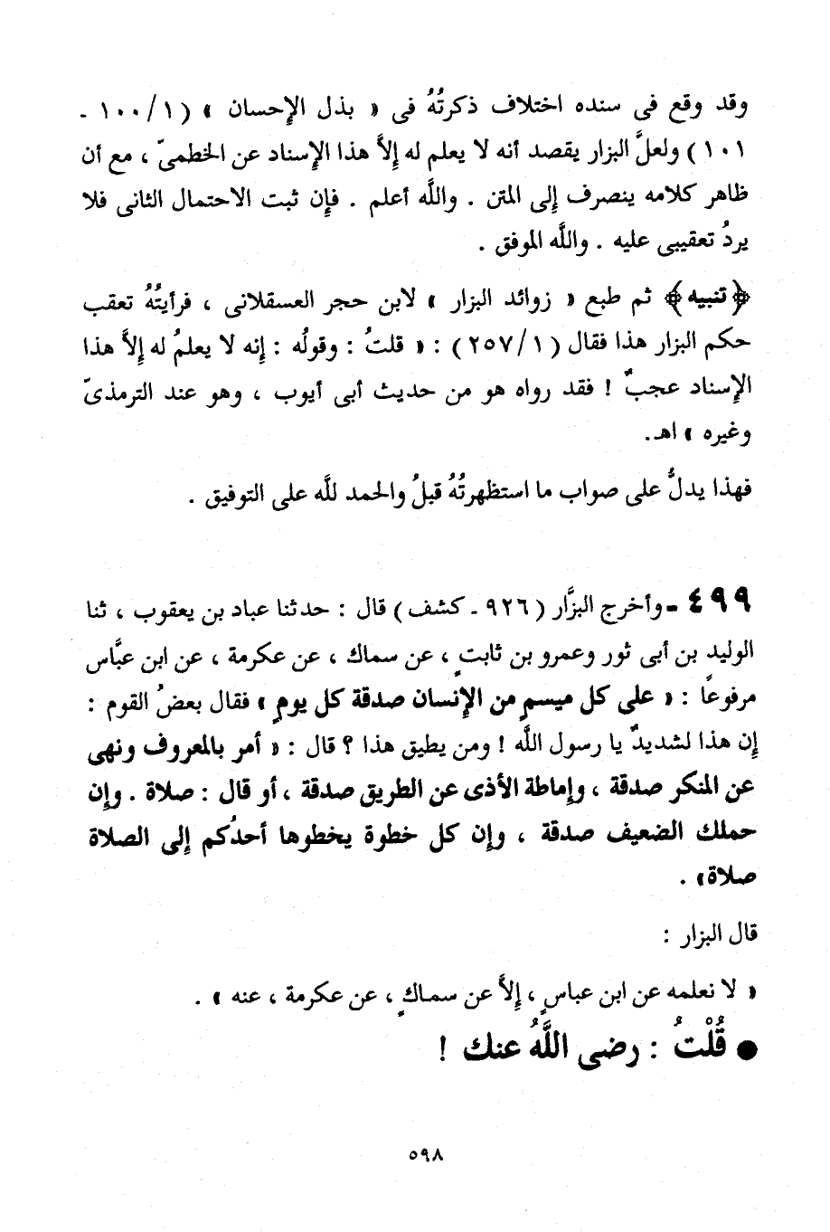 499 - وأخرج البزَّار [926 - كشف] قال: حدثنا عبد بن يعقوب، ثنا الوليد بن أبي ثور وعمرو بن ثابت، عن سماك، عن عكرمة، عن ابن عبَّاس مرفوعًا "على كل ميسمٍ من الإِنسان صدقة كل يومٍ" فقال بعضُ القوم: إِن هذا لشديدٌ يا رسول الله! ومن يطيق هذا؟ قال: "أمر بالمعروف ونهي عن المنكر صدقة، وإِماطة الأذى عن الطريق صدقة، أو قال: صلاة. وإن حملك الضعيف صدقة، وإن كل خطوة يخطوها أحدُكم إلى الصلاة صلاة".