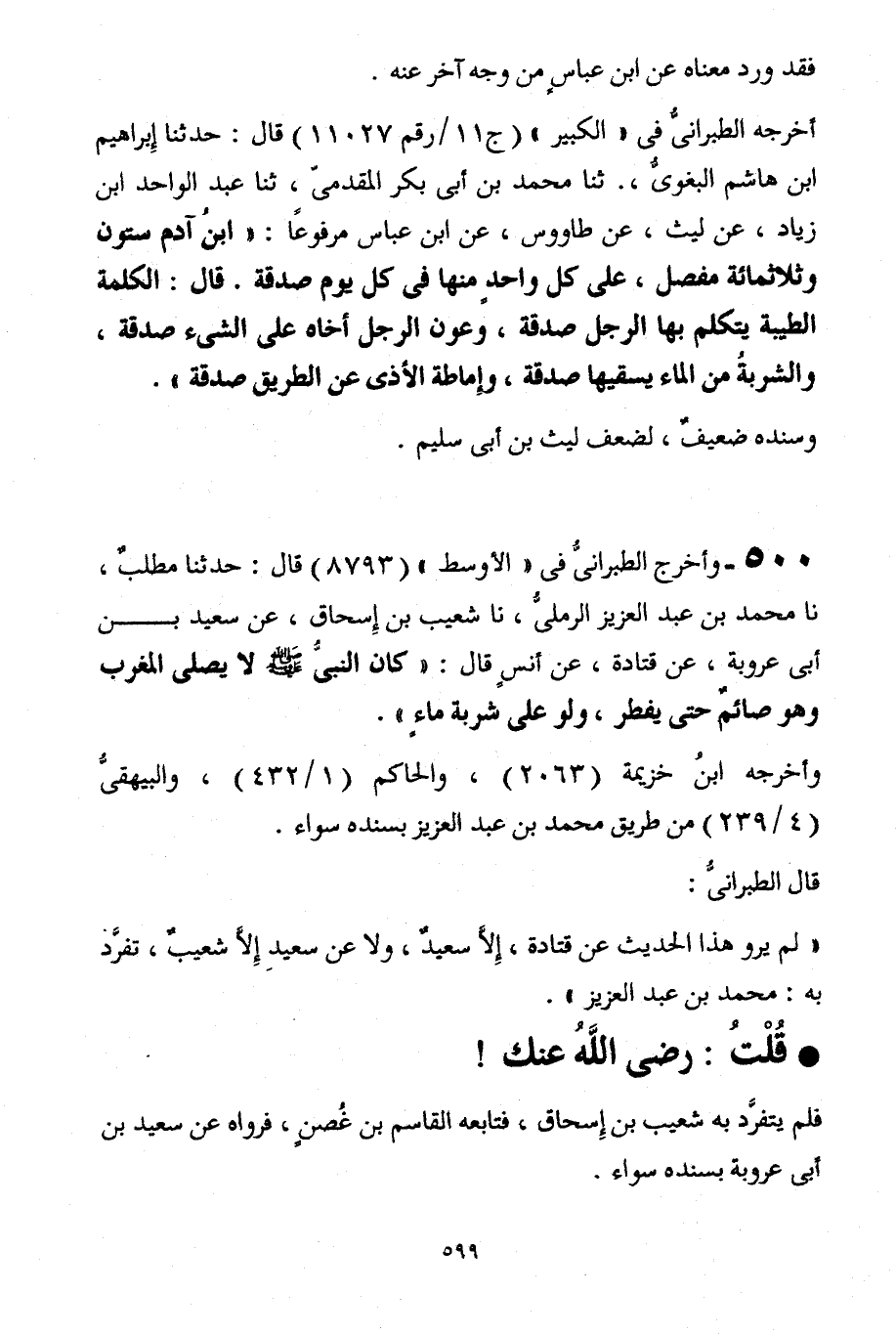" لم يرو هذا الحديث عن قتادة، إِلاَّ سعيدٌ، ولا عن سعيدٍ إِلاَّ شعيبٌ، تفرَّد به: محمد بن عبد العزيز".