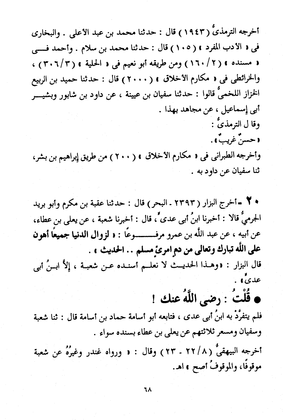 20- أخرج البزار (2393 – البحر) قال: حدثنا عقبة بن مكرم وأبو بريد الجرمىُّ قالا: أخبرنا ابن أبى عدىٍّ قال: أخبرنا شعبة، عن يعلى بن عطاء، عن أبيه، عن عبد الله بن عمرو مرفوعاً: ((لزوال الدنيا جميعاً أهون على الله تبارك وتعالى من دمٍ امرئٍ مسلم. . . الحديث)) .