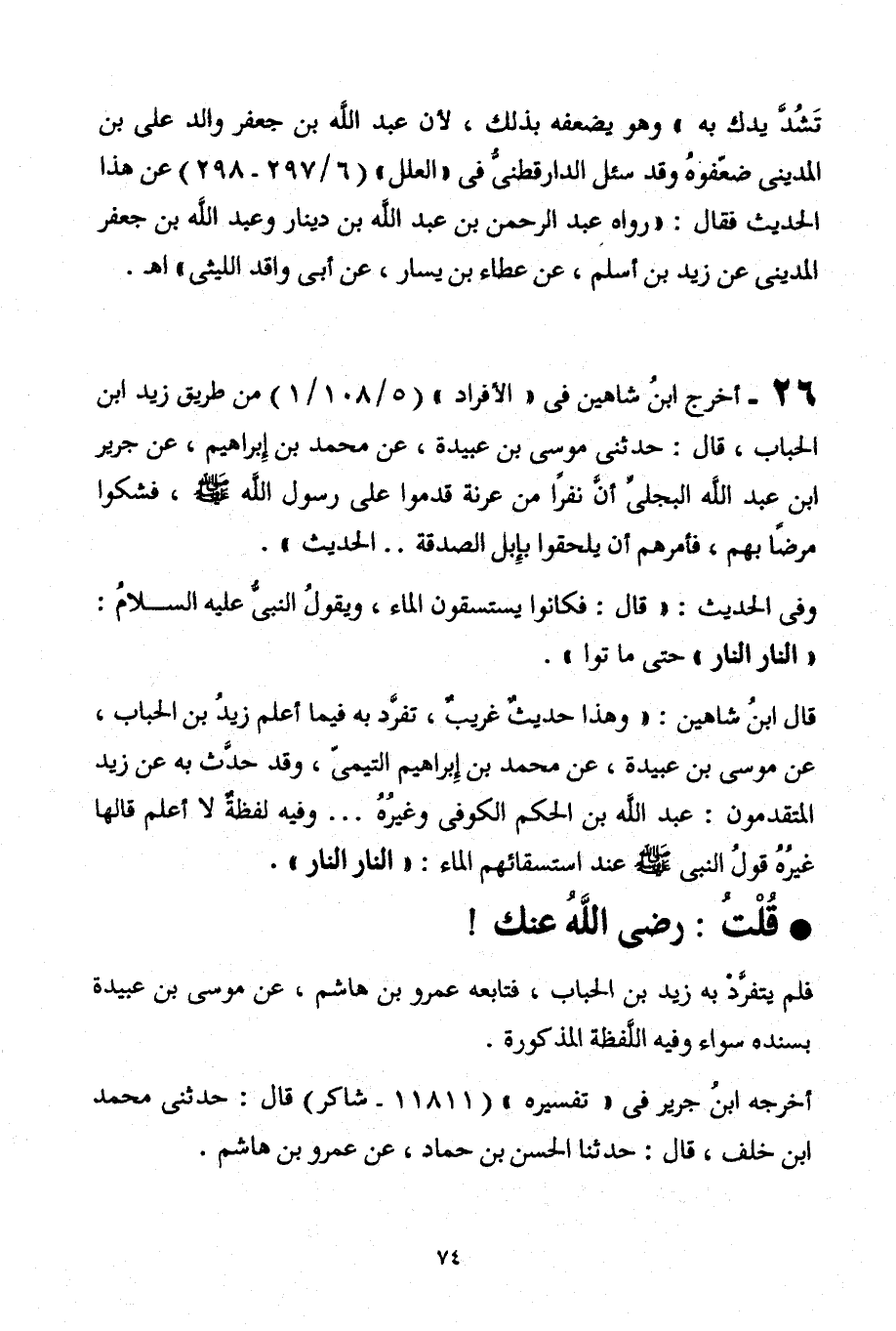 26- أخرج ابن شاهين فى " الأفراد " (5 / 108 / 1) من طريق زيد ابن الحباب، قال: حدثنى موسى بن عبيدة، عن محمد بن إبراهيم، عن جرير ابن عبد الله البجلىِّ أن نفراً من عرنة قدموا على رسول الله صلى الله عليه وسلم، فشكوا مرضا بهم، فأمرهم أن يلحقوا بإبل الصدقة.. الحديث.