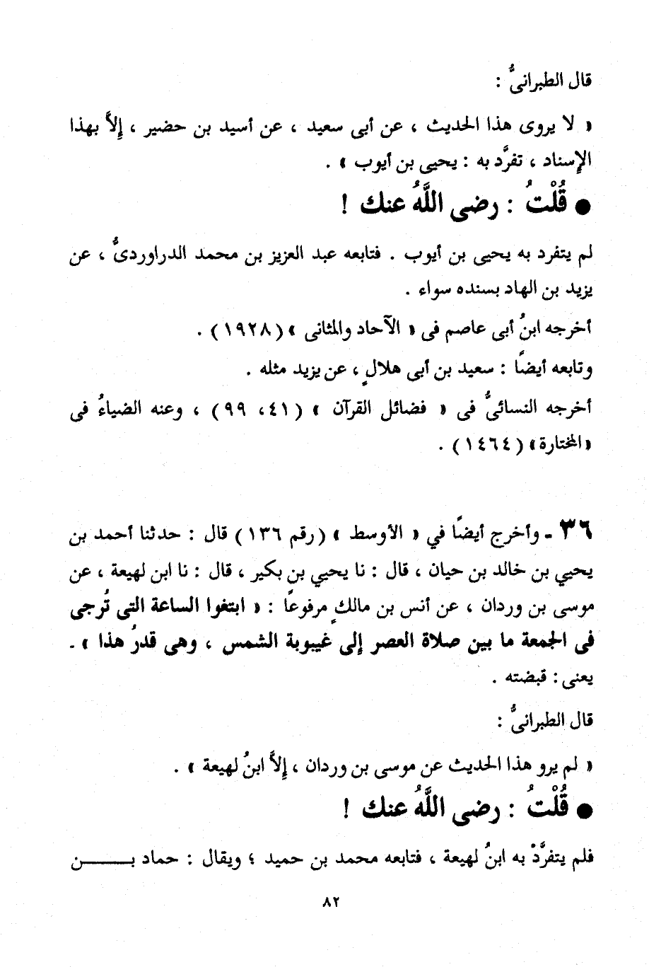 36 – أخرج ايضا فى " الأوسط " (رقم 136) قال: حدثنا أحمد بن يحيى بن خالد بن حيان، قال: نا يحيى بن بكير، قال: نا ابن لهيعة، عن موسى بن وردان، عن أنس بن مالك مرفوعاً: " ابتغوا الساعة التى ترجى فى الجمعة ما بين صلاة العصر إلى غيبوبة الشمس، وهى قدرُ هذا " – يعنى: قبضته.