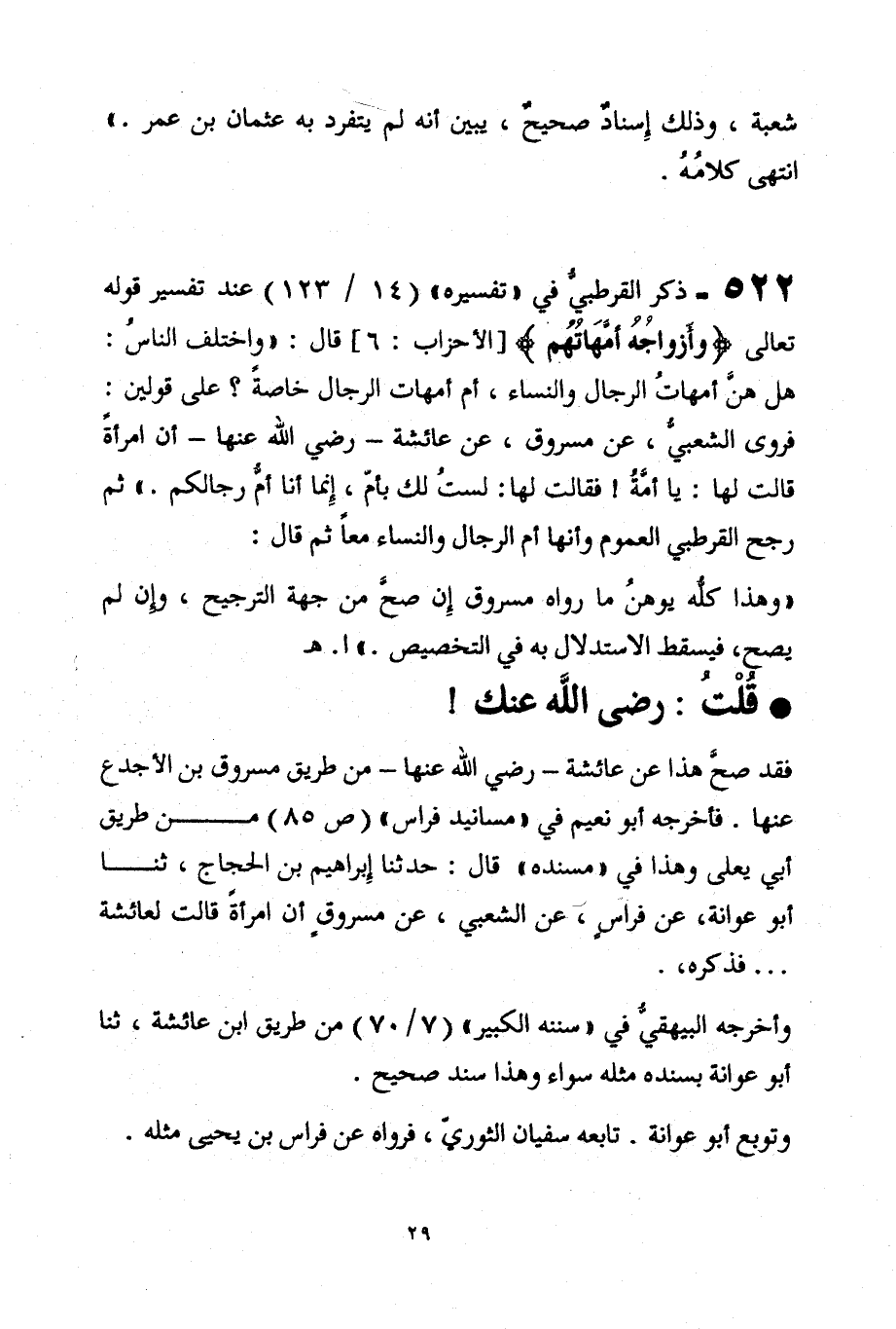 522 - ذكر القرطبيُّ في "تفسيره" (14 / 123) عند تفسير قوله تعالى (وأزواجُهُ أمَّهاتُهُم) [الأحزاب: 6] قال: "واختلف الناسُ: هل هنَّ أمهاتُ الرجال والنساء، أم أمهات الرجال خاصة؟ على قولين: فروى الشعبيُّ، عن مسروق، عن عائشة -رضي الله عنها- أن امرأةً قالت لها: يا أمةُ! فقالت لها: لستُ لك بأمّ، إنما أنا أمُّ رجالكم. " ثم رجح القرطبي العموم وأنها أم الرجال والنساء معًا ثم قال: