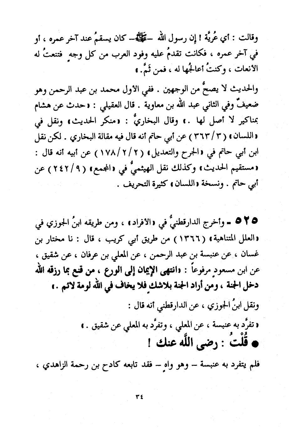 525 - وأخرج الدارقطنيُّ في "الأفراد"، ومن طريقه ابنُ الجوزي في "العلل المتناهية" (1366) من طريق أبي كريب، قال: نا مختار بن غسان، عن عنبسة بن عبد الرحمن، عن المعلي بن عرقان، عن شقيق، عن ابن مسعودٍ مرفوعًا: "انتهى الإيمان إلى الورع، من قنع بما رزقه الله دخل الجنة، ومن أراد الجنة بلا شكٍ فلا يخاف في الله لومة لائم. "