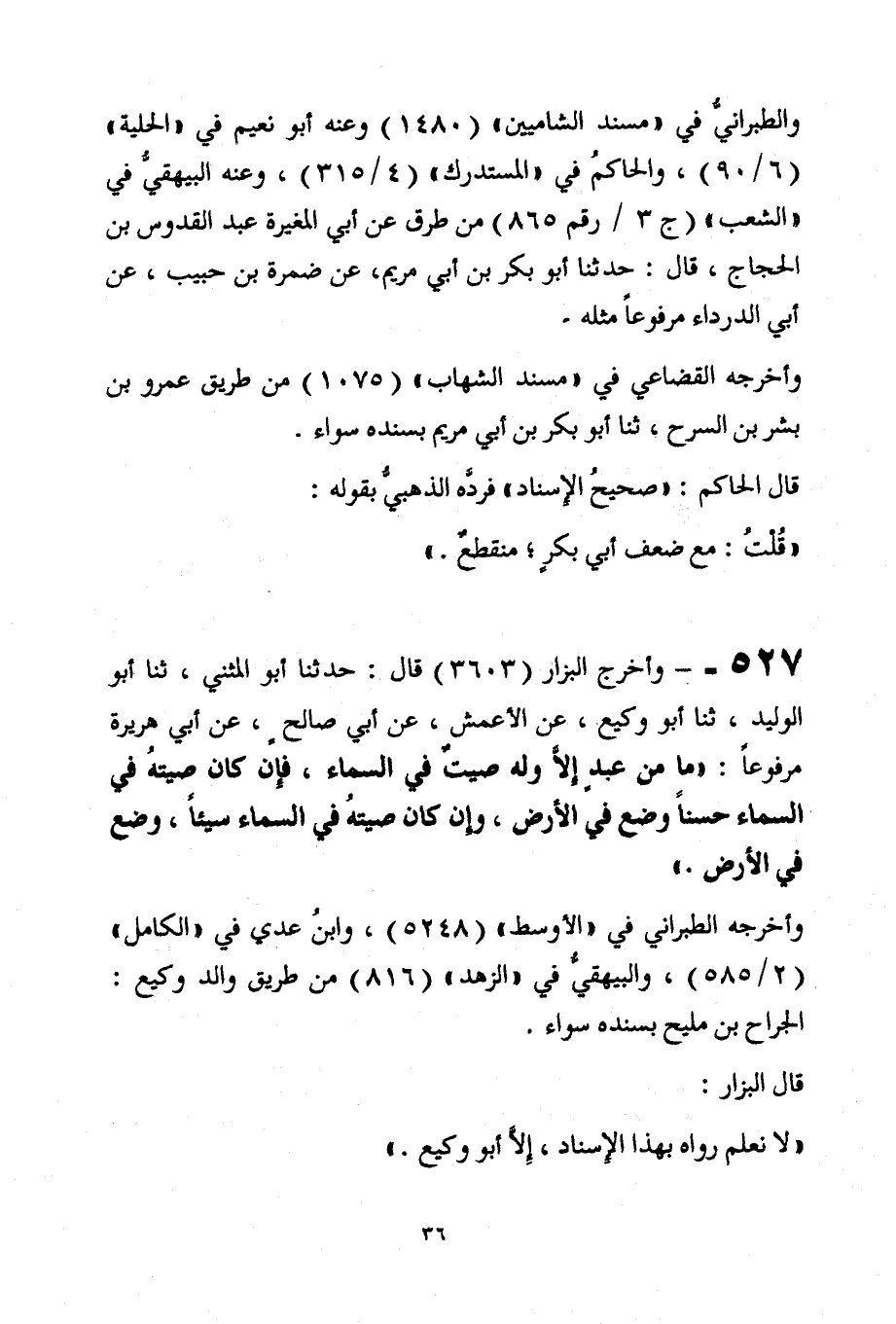 527- وأخرج البزار (3603) قال: حدثنا أبو المثنى، ثنا أبو الوليد، ثنا أبو وكيع، عن الأعمش، عن أبي صالحٍ، عن أبي هريرة مرفوعًا: "ما من عبد إلاَّ وله صيتٌ في السماء، فإن كان صيتهُ في السماء حسنًا وضع في الأرض، وإن كان صيتهُ في السماء سيئًا، وضع في الأرض. "