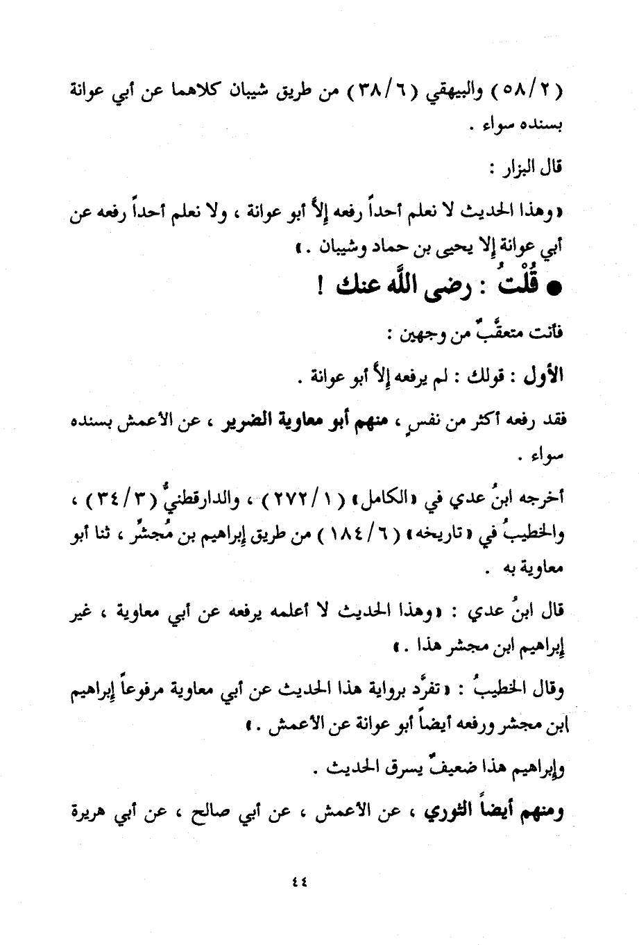 وقال الخطيبُ: "تفرَّد برواية هذا الحديث عن أبي معاوية مرفوعًا إِبراهيم ابن مجشر ورفعه أيضًا أبو عوانة عن الأعمش. "