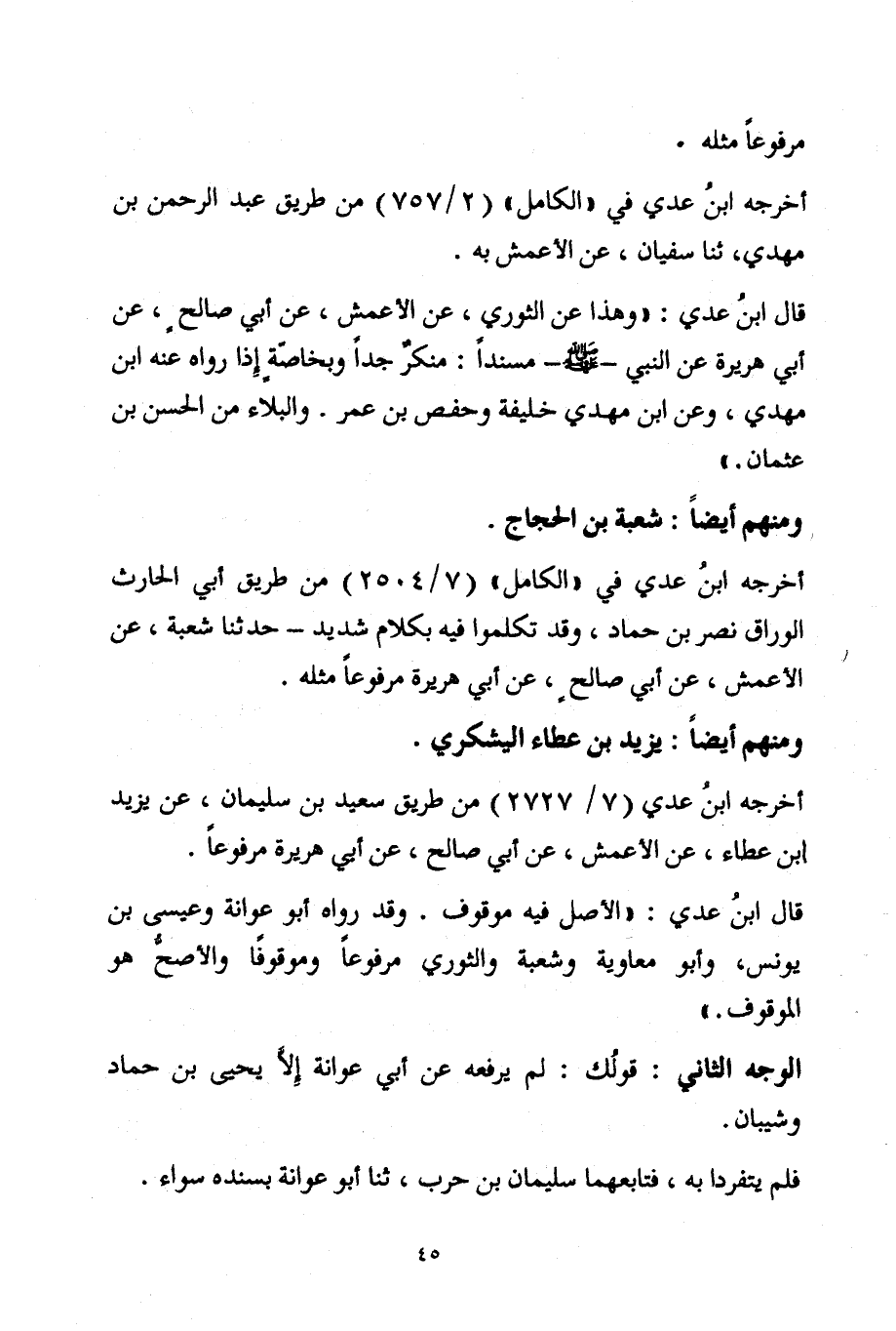 قال ابنُ عدي: "الأصل فيه موقوف. وقد رواه أبو عوانة وعيس بن يونس، وأبو معاوية وشعبة والثوري مرفوعًا وموقوفًا والأصحُّ هو الموقوف. "