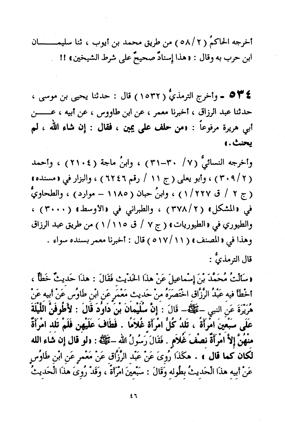 "سَألْتُ مُحَمَّدَ بْنَ إِسْماعيلَ عَنْ هذا الحَديث فَقَالَ: هذا حَديثٌ خَطأٌ، أخْطأَ فيه عَبْدُ الرَّزَّاق اخْتصَرَهُ مِنْ حَديث مَعْمَرٍ عَن ابْن طَاوُس عَنْ أَبيهِ عَنْ هُرَيْرْةَ عَنِ النبي -صلى الله عليه وسلم- قَالَ: إنَّ سُلَيْمانَ بْنَ دَاوُدَ قَالَ: لأَطُوفَنَّ اللَّيْلَةَ عَلَى سَبْعينَ امْرَأَةً، تَلدُ كُلُّ امْرَأَةٍ غُلاَمًا. فَطَافَ عَلَيْهِن فَلَمْ تَلِدِ امْرَأَةٌ مِنْهُنَّ إِلاَّ امْرَأَةٌ نصْفَ غُلاَمٍ. فَقَالَ رَسُولُ الله -صلى الله عليه وسلم-: "لو قال إن شاء الله لكان كما قال ". هكَذَا رُوِيَ عَنْ عَبْدِ الرَّزَّاق عَنْ مَعْمرٍ عَنِ ابْنِ طاوُس عَنْ أبيه هذاَ الْحَديثُ بطُوله وَقَالَ: سَبْعينَ امَّرأةً، وقَدْ رُوي هذا الحديث