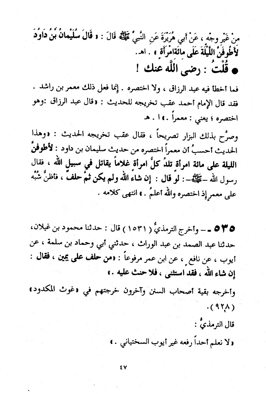 535 - وأخرج الترمذيُّ (1531) قال: حدثنا محمود بن غيلان، حدثنا عبد الصمد بن عبد الوارث، حدثني أبي وحماد بن سلمة، عن أيوب، عن نافعٍ، عن ابن عمر مرفوعًا: "من حلف على يمين، فقال: إن شاء الله، فقد استثنى، فلا حنث عليه. "