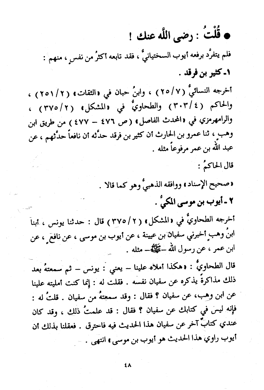 أخرجه النسائيُّ (7/25) ، وابنُ حبان في "الثقات" (2/251) ، والحاكم (4 / 303) والطحاويُّ في "المشكل" (2/375) ، والرامهرمزي في "المحدث الفاصل" (ص 476 - 477) من طريق ابن وهبٍ، ثنا عمرو بن الحارث أن كثير بن فرقد حدَّثه أن نافعًا حدَّثهم، عن عبد الله بن عمر مرفوعًا مثله.