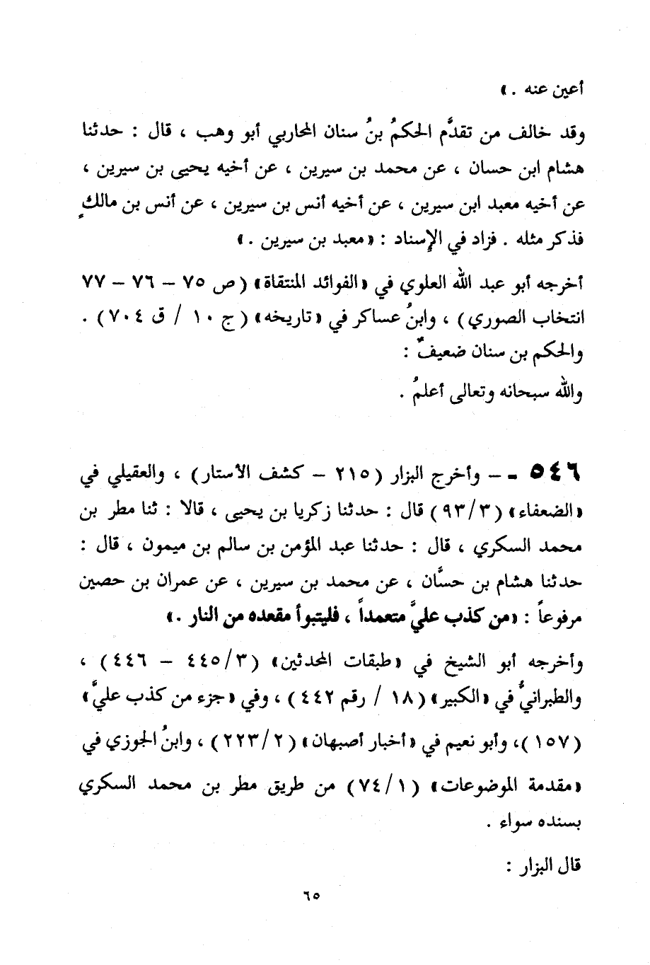 546 - وأخرج البزار (215 - كشف الأستار) ، والعقيلي في "الضعفاء" (3 / 93) قال: حدثنا زكريا بن يحيى، قالا: ثنا مطر بن محمد السكري، قال: حدثنا عبد المؤمن بن سالم بن ميمون، قال: حدثنا هشام بن حسَّان، عن محمد بن سيرين، عن عمران بن حصين مرفوعًا: "من كذب عليَّ متعمدًا، فليتبوأ مقعده من النار. "