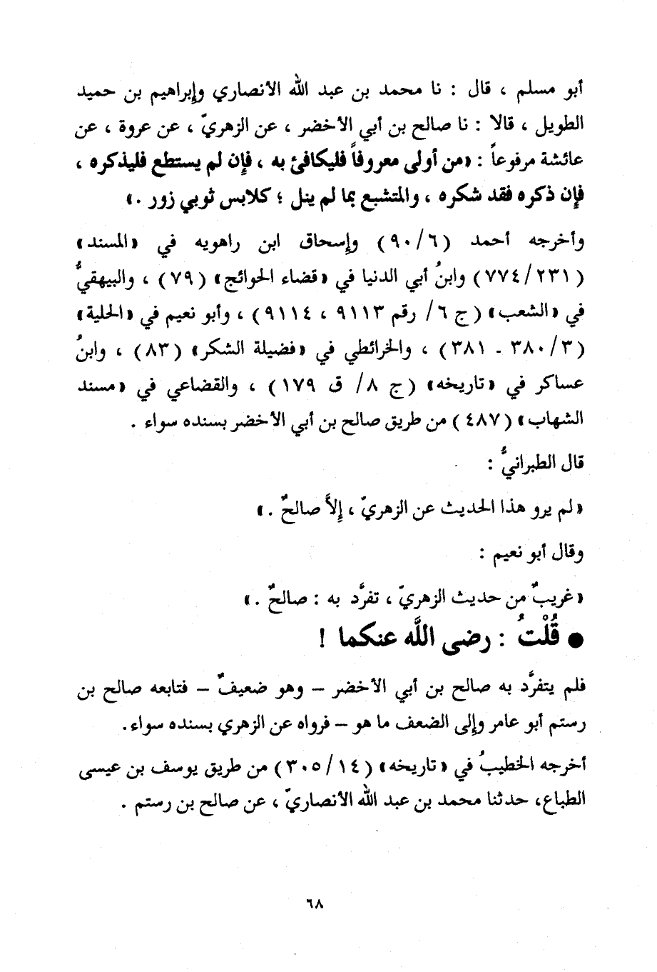 أبو مسلم، قال: نا محمد بن عبد الله الأنصاري وإبراهيم بن حميد الطويل، قالا، نا صالح بن أبي الأخضر، عن الزهريّ، عن عروة، عن عائشة مرفوعًا: "من أولى معروفًا فليكافئ به، فإن لم يستطع فليذكره، فإن ذكره فقد شكره، المتشبع بما لم ينل؛ كلابس ثوبي زور. "