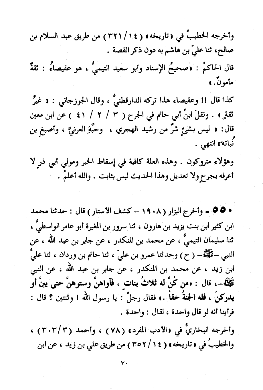 550 - وأخرج البزار [1908 - كشف الأستار] قال: حدثنا محمد ابن كثير ابن بنت يزيد بن هارون، ثنا سرور بن المغيرة أبو عامر الواسطيُّ، ثنا سليمان التيميُّ، عن محمد بن المنكدر، عن جابر بن عبد الله، عن النبي -صلى الله عليه وسلم- (ح) وحدثنا عمرو بن عليّ، ثنا حاتم بن وردان، ثنا عليُّ ابن زيد، عن محمد بن المنكدر، عن جابر بن عبد الله، عن النبي -صلى الله عليه وسلم-، قال: "من كُنَّ له ثلاثُ بناتٍ، فآواهنَّ وسترهنْ حتى يبن أو يدركنَ، فله الجنةُ حقًا. " فقال رجلٌ: يا رسول الله! وثنتين؟ قال: فرأينا أنه لو قال واحدة، لقال: واحدة.