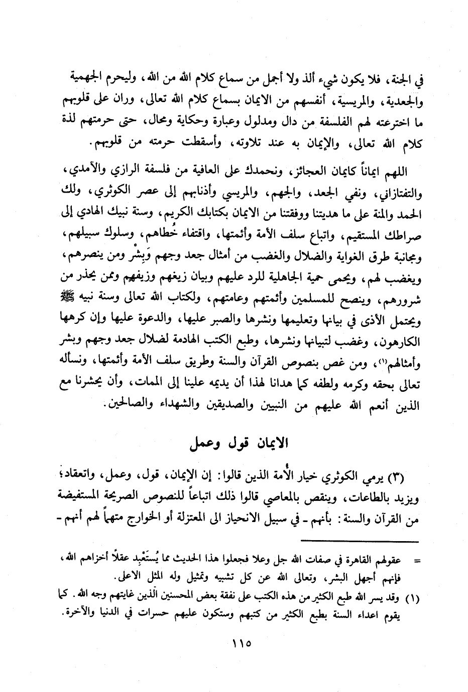 اللهم ايماناً كإيمان العجائز، ونحمدك على العافية من فلسفة الرازي والآمدي، والتفتازاني، ونفي الجعد، والجهم، والمريسي وأذنابهم إلى عصر الكوثري، ولك الحمد والمنة على ما هديتنا ووفقتنا من الايمان بكتابك الكريم، وسنة نبيك الهادي إلى صراطك المستقيم، واتباع سلف الأمة وأئمتها، واقتفاء خُطاهم، وسلوك سبيلهم، ومجانبة طرق الغواية والضلال والغضب من أمثال جعد وجهم وَبِشْر ومن ينصرهم، ويغضب لهم، ويحمى حمية الجاهلية للرد عليهم وبيان زيغهم وزيفيم وممن يحذر من شرورهم، وينصح للمسلمين وأئمتهم وعامتهم، ولكتاب الله تعالى وسنة نبيه - صلى الله عليه وسلم - ويحتمل الأذى في بيانها وتعليمها ونشرها والصبر عليها، والدعوة عليها وإن كرهها الكارهون، وغضب لتبيانها ونشرها، وطبع الكتب الهادمة لضلال جعد وجهم وبشر وأمثالهم (1) ، ومن غص بنصوص القرآن والسنة وطريق سلف الأمة وأئمتها، ونسأله تعالى بحقه وكرمه ولطفه كما هدانا لهذا أن يديمه علينا إلى الممات، وأن يحشرنا مع الذين أنعم الله عليهم من النبيين والصديقين والشهداء والصالحين.
