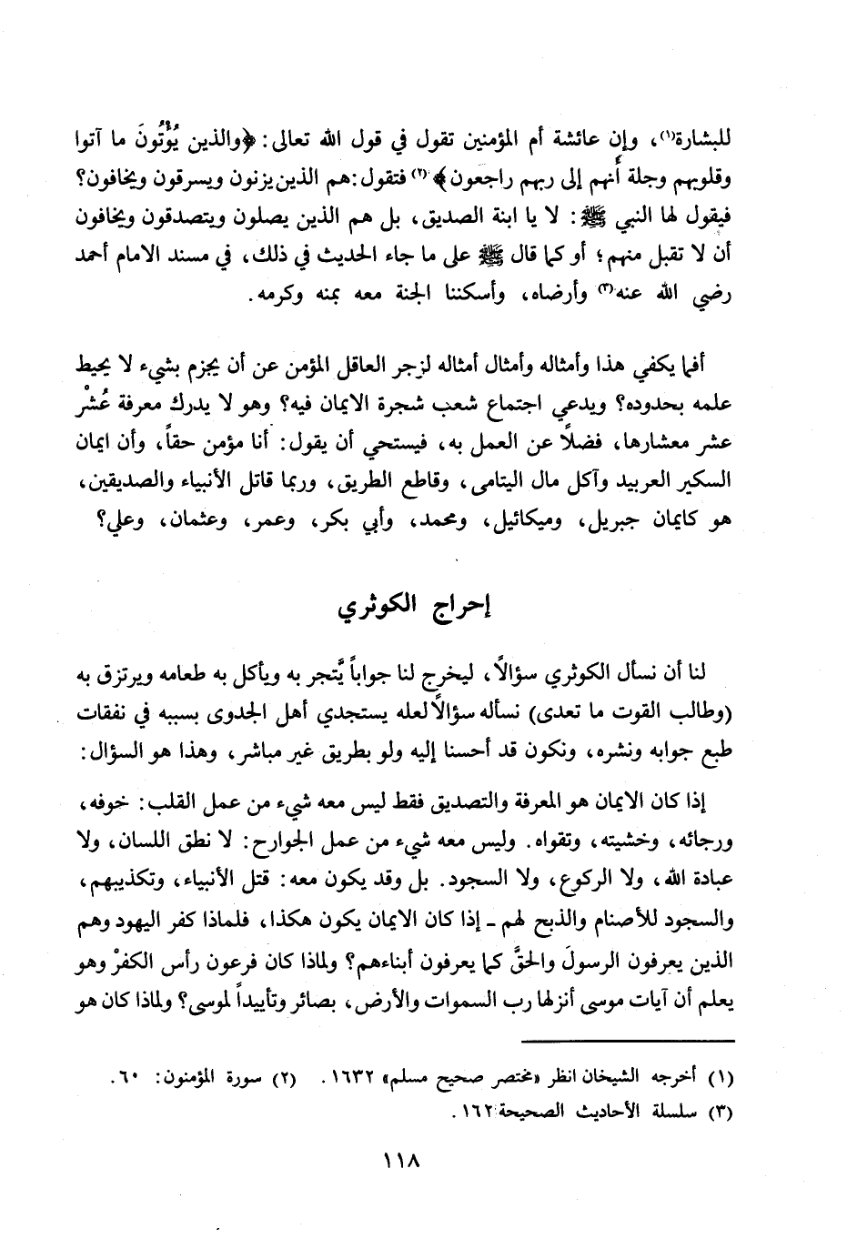 للبشارة (1) ، وإن عائشة أم المؤمنين تقول في قول الله تعالى: " وَالَّذِينَ يُؤْتُونَ مَا آَتَوْا وَقُلُوبُهُمْ وَجِلَةٌ أَنَّهُمْ إِلَى رَبِّهِمْ رَاجِعُونَ " (2) فتقول: هم الذين يزنون ويسرقون ويخافون؟ فيقَول لها النبي - صلى الله عليه وسلم -: لا يا ابنة الصديق، بل هم الذين يصلون ويتصدقون ويخافون أن لا تقبل منهم؛ أوكما قال - صلى الله عليه وسلم - على ما جاء الحديث في ذلك، في مسند الإمام أحمد رضي الله عنه (3) وأرضاه، وأسكننا الجنة معه بمنه وكرمه.