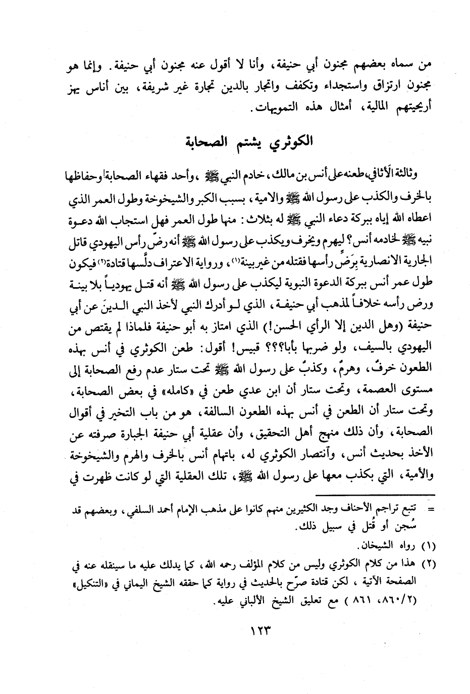 وثالثة الأثافي طعنه على أنس بن مالك، خادم النبي - صلى الله عليه وسلم -، وأحد فقهاء الصحابة! وحفاظها بالخرف والكذب على رسول الله - صلى الله عليه وسلم - والأمية، بسبب الكبر والشيخوخة وطول العمر الذي أعطاه الله إياه ببركة دعاء النبي - صلى الله عليه وسلم - له بثلاث: منها طول العمر فهل استجاب الله دعوة نبيه - صلى الله عليه وسلم - لخادمه أنس؟ ليهرم ويخرف ويكذب على رسول الله - صلى الله عليه وسلم - أنه رضّ رأس اليهودي قاتل الجارية الانصارية بِرَضّ رأسها فقتله من غير بينة (1) ، ورواية الاعتراف دلَّسها قتادة (2) فيكون طول عمر أنس ببركة الدعوة النبوية ليكذب على رسول الله - صلى الله عليه وسلم - أنه قتل يهودياً بلا بينة ورض رأسه خلافاً لمذهب أبي حنيفة، الذي لو أدرك النبي لأخذ النبي الدينَ عن أبي حنيفة (وهل الدين إلا الرأي الحسن!) الذي امتاز به أبو حنيفة فلماذا لم يقتص من اليهودي بالسيف، ولو ضربها بأبا؟؟؟ قبيس! أقول: طعن الكوثري في أنس بهذه الطعون خرفٌ، وهرمٌ، وكذب على رسول الله - صلى الله عليه وسلم - تحت ستار عدم رفع الصحابة إلى مستوى العصمة، وتحت ستار أن ابن عدي طعن في "كامله " في بعض الصحابة، وتحت ستار أن الطعن في أنس بهذه الطعون السالفة، هو من باب التخير في أقوال الصحابة، وأن ذلك منهج أهل التحقيق، وأن عقلية أبي حنيفة الجبارة صرفته عن الأخذ بحديث أنس، وانتصار الكوثري له، باتهام أنس بالخرف والهرم والشيخوخة والأمية، التي يكذب معها على رسول الله - صلى الله عليه وسلم -، تلك العقلية التي لو كانت ظهرت في
