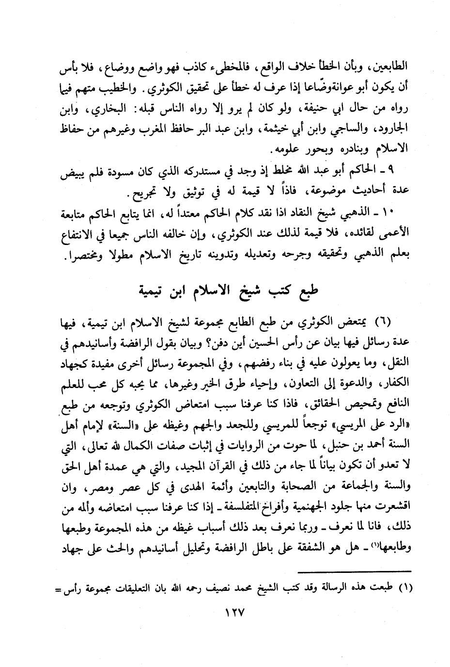 (6) يمتعض الكوثري من طبع الطابع مجموعة لشيخ الإسلام ابن تيمية، فيها عدة رسائل فيها بيان عن رأس الحسين أين دفن؟ وبيان بقول الرافضة وأسانيدهم في النقل، وما يعولون عليه في بناء رفضهم، وفي المجموعة رسائل أخرى مفيدة كجهاد الكفار، والدعوة إلى التعاون، وإحياء طرق الخير وغيرها، مما يحبه كل محب للعلم النافع وتمحيص الحقائق، فإذا كنا عرفنا سبب امتعاض الكوثري وتوجعه من طبع (الرد على المريسي) توجعاً للمريسي وللجعد والجهم وغيظه على "السنة" لإمام أهل السنة أحمد بن حنبل، لما حوت من الروايات في إثبات صفات الكمال لله تعالى، التي لا تعدو أن تكون بياناً لما جاء من ذلك في القرآن المجيد، والتي هي عمدة أهل الحق والسنة والجماعة من الصحابة والتابعين وأئمة الهدى في كل عصر ومصر، وإن اقشعرت منها جلود الجهنمية وأفراخ المتفلسفة- إذا كنا عرفنا سبب امتعاضه وألمه من ذلك، فإنا لما نعرف- وربما نعرف بعد ذلك أسباب غيظه من هذه المجموعة وطبعها وطابعها (1) - هل هو الشفقة على باطل الرافضة وتحليل أسانيدهم والحث على جهاد