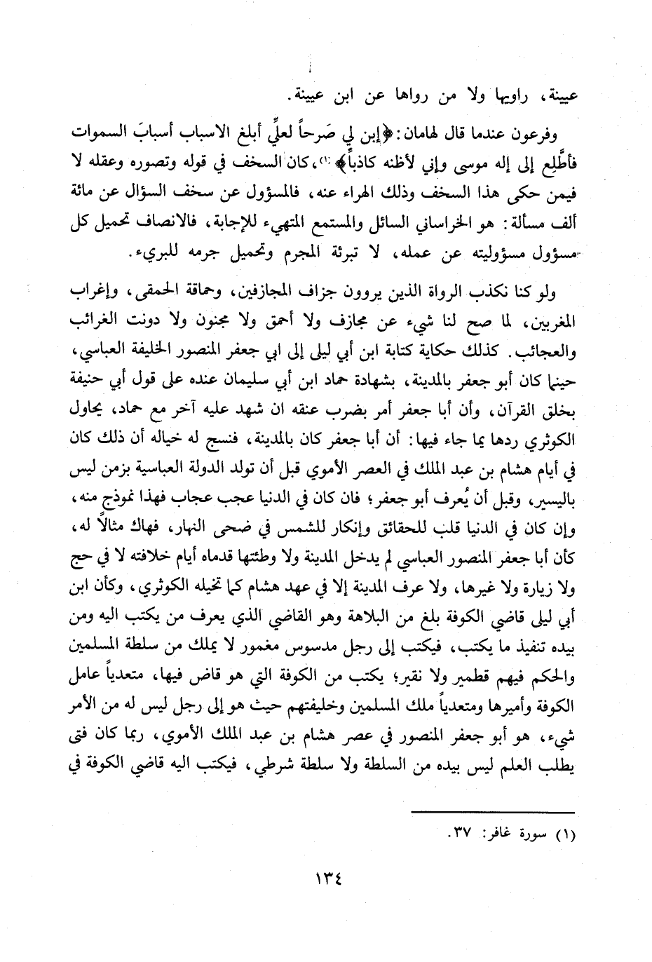 ولو كنا نكذب الرواة الذي يروون جزاف المجازفين، وحماقة الحمقى، وإغراب المغربين، لما صح لنا شيء عن مجازف ولا أحمق ولا مجنون ولا دونت الغرائب والعجائب. كذلك حكاية كتابة ابن أبي ليلى إلى أبي جعفر المنصور الخليفة العباسي، حينما كان أبو جعفر بالمدينة، بشهادة حماد ابن أبي سليمان عنده على قول أبي حنيفة بخلق القرآن، وأن أبا جعفر أمر بضرب عنقه إن شهد عليه آخر مع حماد، يحاول الكوثري ردها بما جاء فيها: أن أبا جعفر كان بالمدينة، فنسج له خياله أن ذلك كان في أيام هشام بن عبد الملك في العصر الأموي قبل أن تولد الدولة العباسية بزمن ليس باليسير، وقبل أن يعرف أبو جعفر؛ فإن كان في الدنيا عجب عجاب فهذا نموذج منه، وإن كان في الدنيا قلب للحقائق وإنكار للشمس في ضحى النهار، فهاك مثالا له، كأن أبا جعفر المنصور العباسي لم يدخل المدينة ولا وطئتها قدماه أيام خلافته لا في حج ولا زيارة ولا غيرها، ولا عرف المدينة إلا في عهد هشام كما تخيله الكوثري، وكأن ابن أبي ليلى قاضي الكوفة بلغ من البلاهة وهو القاضي الذي يعرف من يكتب إليه ومن بيده تنفيذ ما يكتب، فيكتب إلى رجل مدسوس مغمور لا يملك من سلطة المسلمين والحكم فيهم قطمير ولا نقير؛ يكتب من الكوفة التي هو قاض فيها، متعديا عامل الكوفة وأميرها ومتعديا ملك المسلمين وخليفتهم حيث هو إلى رجل ليس له من الأمر شيء، هو أبو جعفر المنصور في عصر هشام بن عبد الملك الأموي، ربما كان فتى يطلب العلم ليس بيده من السلطة ولا سلطة شرطي، فيكتب إليه قاضي الكوفة في