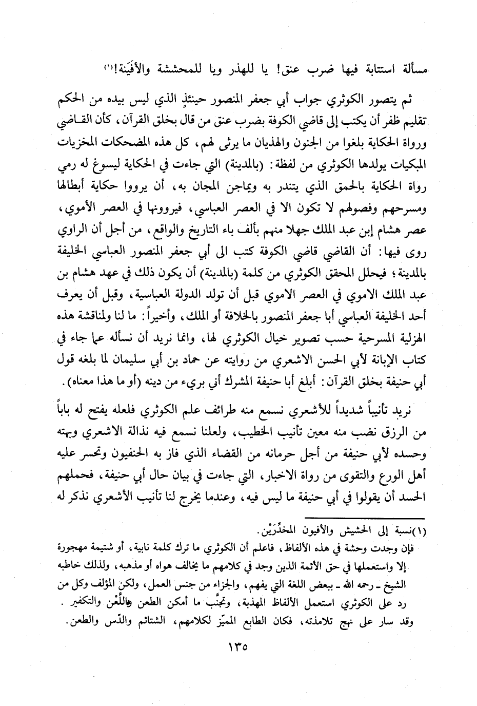 ثم يتصور الكوثري جواب أبي جعفر المنصور حينئذ الذي ليس بيده من الحكم تقليم ظفر أن يكتب إلى قاضي الكوفة بضرب عنق من قال بخلق القرآن، كأن القاضي ورواة الحكاية بلغوا من الجنون والهذيان ما يرثي لهم، كل هذه المضحكات المخزيات المبكيات يولدها الكوثري من لفظة: (المدينة) التي جاءت في الحكاية ليسوغ له رمي رواة الحكاية بالحمق الذي يتندر به ويماجن المجان به، أن يرووا حكاية أبطالها ومسرحهم وفصولهم لا تكون إلا في العصر العباسي، فيروونها في العصر الأموي، عصر هشام ابن عبد الملك جهلا منهم بألف باء التاريخ والواقع، من أجل أن الرواي روى فيها: أن القاضي قاضي الكوفة كتب إلى أبي جعفر المنصور العباسي الخليفة بالمدينة؛ فيحلل المحقق الكوثري من كلمة (بالمدينة) أن يكون ذلك في عهد هشام بن الملك الأموي قبل أن تولد الدولة العباسية، وقبل أن يعرف أحد الخليفة العباسي أبا جعفر المنصور بالخلافة أو الملك، وأخيراً: ما لنا ولمناقشة هذه الهزيلة المسرحية حسب تصوير خيال الكوثري لها، وإنما نريد أن نسأله عما جاء في كتاب الإبانة لأبي الحسن الأشعري من روايته عن حماد بن أبي سليمان لما بلغه قول أبي حنيفة بخلق القرآن: أبلغ أبا حنيفة المشرك أني بريء من دينه (أو ما هذا معناه) .