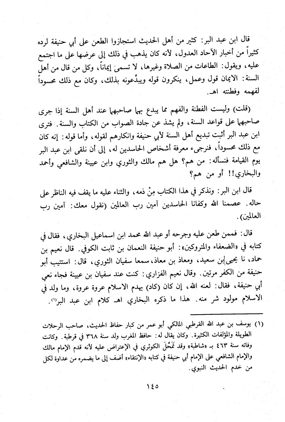 (1) يوسف بن عبد الله القرطبي المالكي أبو عمر من كبار حفاظ الحديث، صاحب الرحلات الطويلة والمؤلفات الكثيرة. وكان يقال له: حافظ المغرب ولد سنة 368 في قرطبة. وكانت وفاته سنة 463 ب "شاطبة" وقد تَمَحَّلَ الكوثري في الإعتراض عليه لأنه قدم الإمام مالك والإمام الشافعي على الإمام أي حنيفة في كتابه "الإنتقاء" أضف إلى ما يضمره من عداوة لكل من خدم الحديث النبوي.