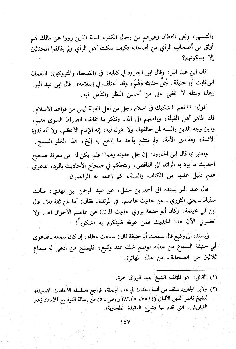 قال ابن عبد البر: وقال ابن الجارود في كتابه: في "الضعفاء والمتروكين": النعمان ابن ثابت أبو حنيفة: جُل حديثه وَهْمٌ، وقد اختلف في إسلامه ". قال ابن عبد البر: وهذا ومثله لا يخفى على من أحسن النظر والتأمل فيه.