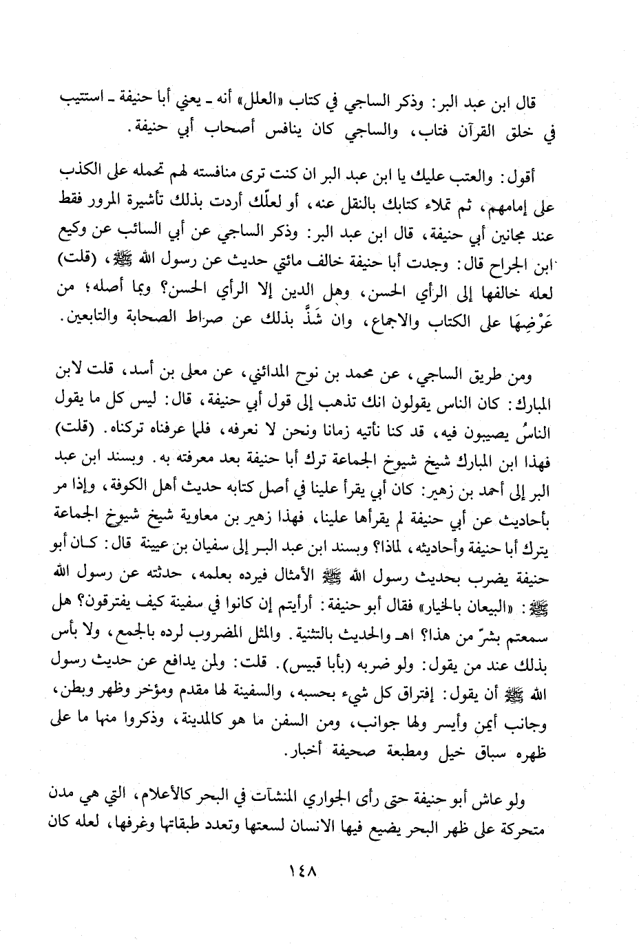 فهذا ابن المبارك شيخ شيوخ الجماعة ترك أبا حنيفة بعد معرفته به. وبسند ابن عبد البر إلى أحمد بن زهير: كان أبي يقرأ علينا في أصل كتابه حديث أهل الكوفة، وإذا مر بأحاديث عن أبي حنيفة لم يقرأها علينا، فهذا زهير بن معاوية شيخ شيوخ الجماعة يترك أبا حنيفة وأحاديثه، لماذا؟ وبسند ابن عبد البر إلى سفيان بن عيينة قال: كان أبو حنيفة يضرب بحديث رسول الله - صلى الله عليه وسلم - الأمثال فيرده بعلمه، حدثته عن رسول الله - صلى الله عليه وسلم -: "البيعان بالخيار" فقال أبو حنيفة: أرأيتم إن كانوا في سفينة كيف يفترقون؟ هل سمعتم بشرّ من هذا؟ اهـ والحديث بالتثنية. والمثل المضروب لرده بالجمع، ولا بأس بذلك عند من يقول: ولو ضربه (بأبا قبيس) . قلت: ولمن يدافع عن حديث رسول الله - صلى الله عليه وسلم - أن يقول: إفتراق كل شيء بحسبه، والسفينة لها مقدم ومؤخر وظهر وبطن، وجانب أيمن وأيسر ولها جوانب، ومن السفن ما هو كالمدينة، وذكروا منها ما على ظهره سباق خيل ومطبعة صحيفة أخبار.