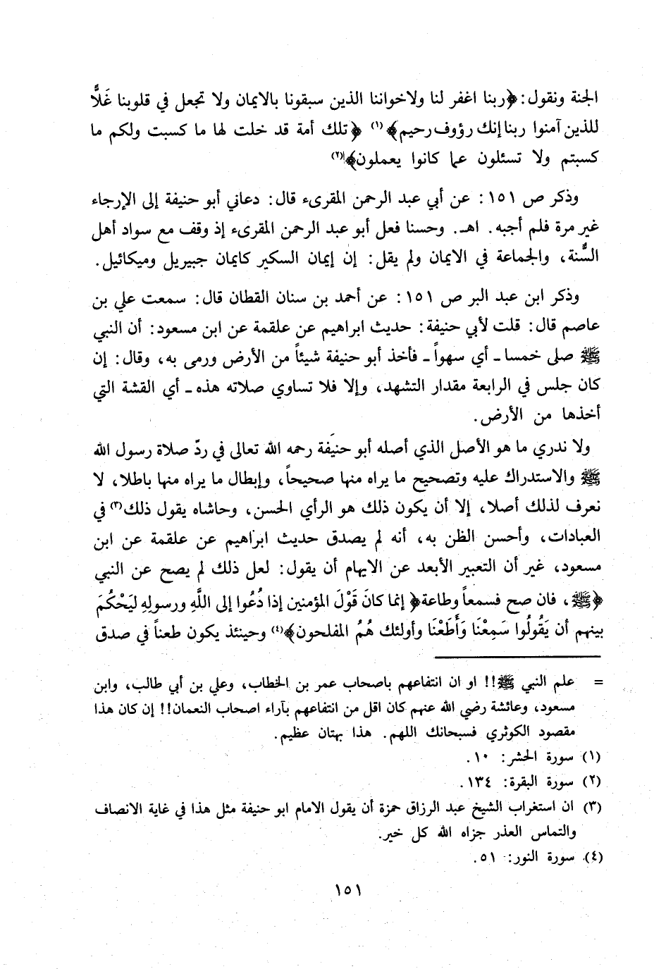 وذكر ص 151: عن أبي عبد الرحمن المقرىء قال: دعاني أبو حنيفة إلى الإرجاء غير مرة فلم أجبه. اهـ. وحسنا فعل أبو عبد الرحمن المقرىء إذ وقف مع سواد أهل السُّنة، والجماعة في الايمان ولم يقل: إن إيمان السكير كايمان جبريل وميكائيل.
