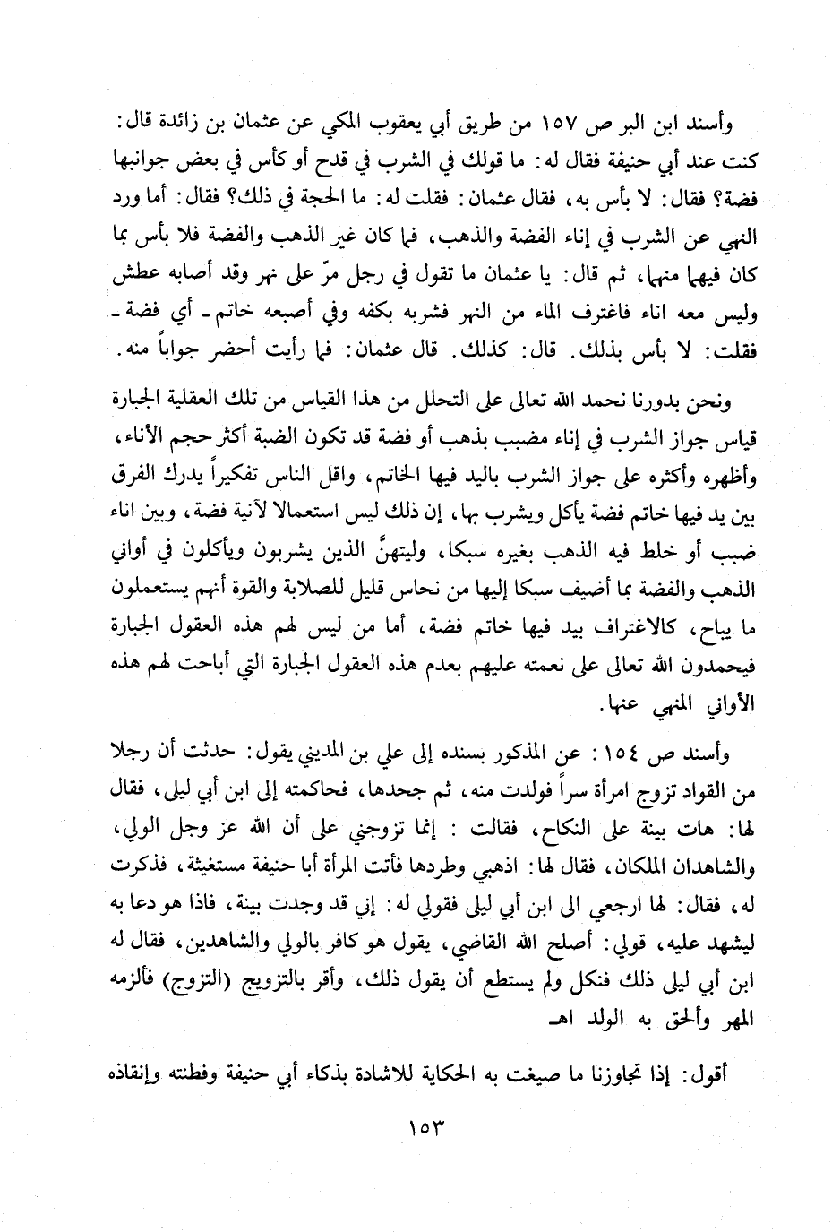 وأسند ابن البر ص 157 من طريق أبي يعقوب المكي عن عثمان بن زائدة قال: كنت عند أبي حنيفة فقال له: ما قولك في الشرب في قدح أوكأس في بعض جوانبها فضة؟ فقال: لا بأس به، فقال عثمان: فقلت له: ما الحجة في ذلك؟ فقال: أما ورد النهي عن الشرب في إناء الفضة والذهب، فما كان غير الذهب والفضة فلا بأس بما كان فيهما منهما، ثم قال: يا عثمان ما تقول في رجل مر على نهر وقد أصابه عطش وليس معه إناء فاغترف الماء من الخهر فشربه بكفه وفي أصبعه خاتم- أي فضة- فقلت: لا بأس بذلك. قال: كذلك. قال عثمان: فما رأيت أحضر جواباً منه.