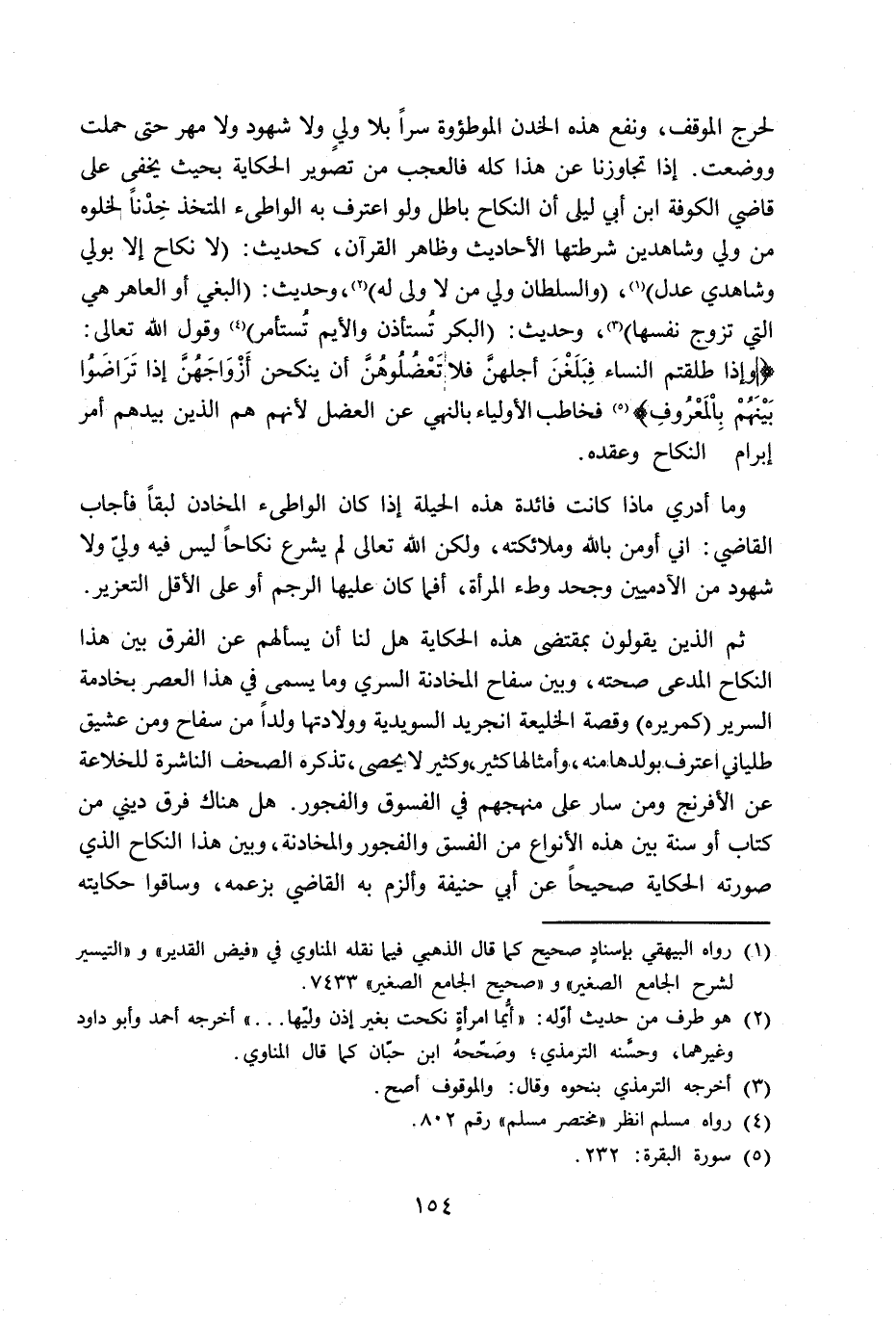 ثم الذين يقولون بمقتضى هذه الحكاية هل لنا أن يسألهم عن الفرق بين هذا النكاح المدعى صحته، وبن سفاح المخادنة السري وما يسمى في هذا العصر بخادمة السرير (كمريره) وقصة الخليعة انجريد السويدية وولادتها ولداً من سفاح ومن عشيق طلياني اعترف بولدها منه وأمثالها كثير، وكثير لا يحصى، تذكره الصحف الناشرة للخلاعة عن الأفرنج ومن سار على منهجهم في الفسوق والفجور. هل هناك فرق ديني من كتاب أو سنة بيئ هذه الأنواع من الفسق والفجور والمخادنة، وبن هذا النكاح الذي صورته الحكاية صحيحاً عن أبي حنيفة وألزم به القاضي بزعمه، وساقوا حكايته
